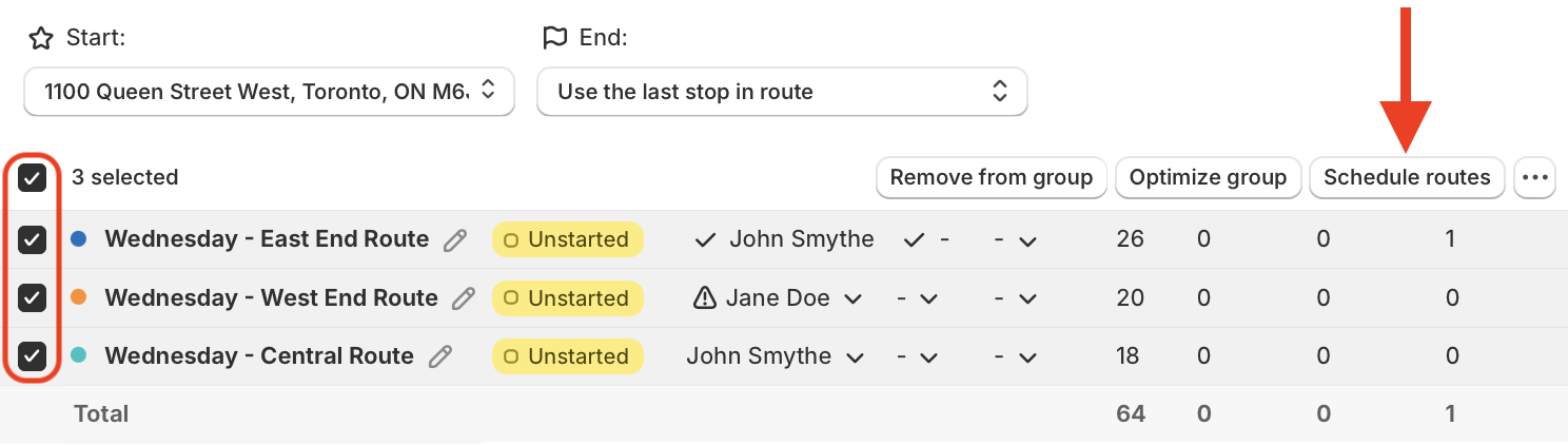 Group and route schedules can also be updated using the checkboxes and bulk actions. From the All routes view of any existing route, use the checkboxes to select which routes to update schedules for; click the Schedule routes button that appears in the upper right-hand corner of the table, and select a desired start date/time as required: