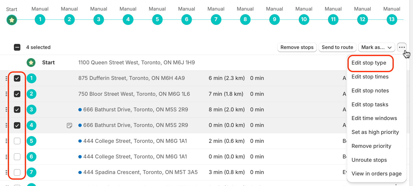 Stop types can also be edited as a bulk action. When viewing a route: