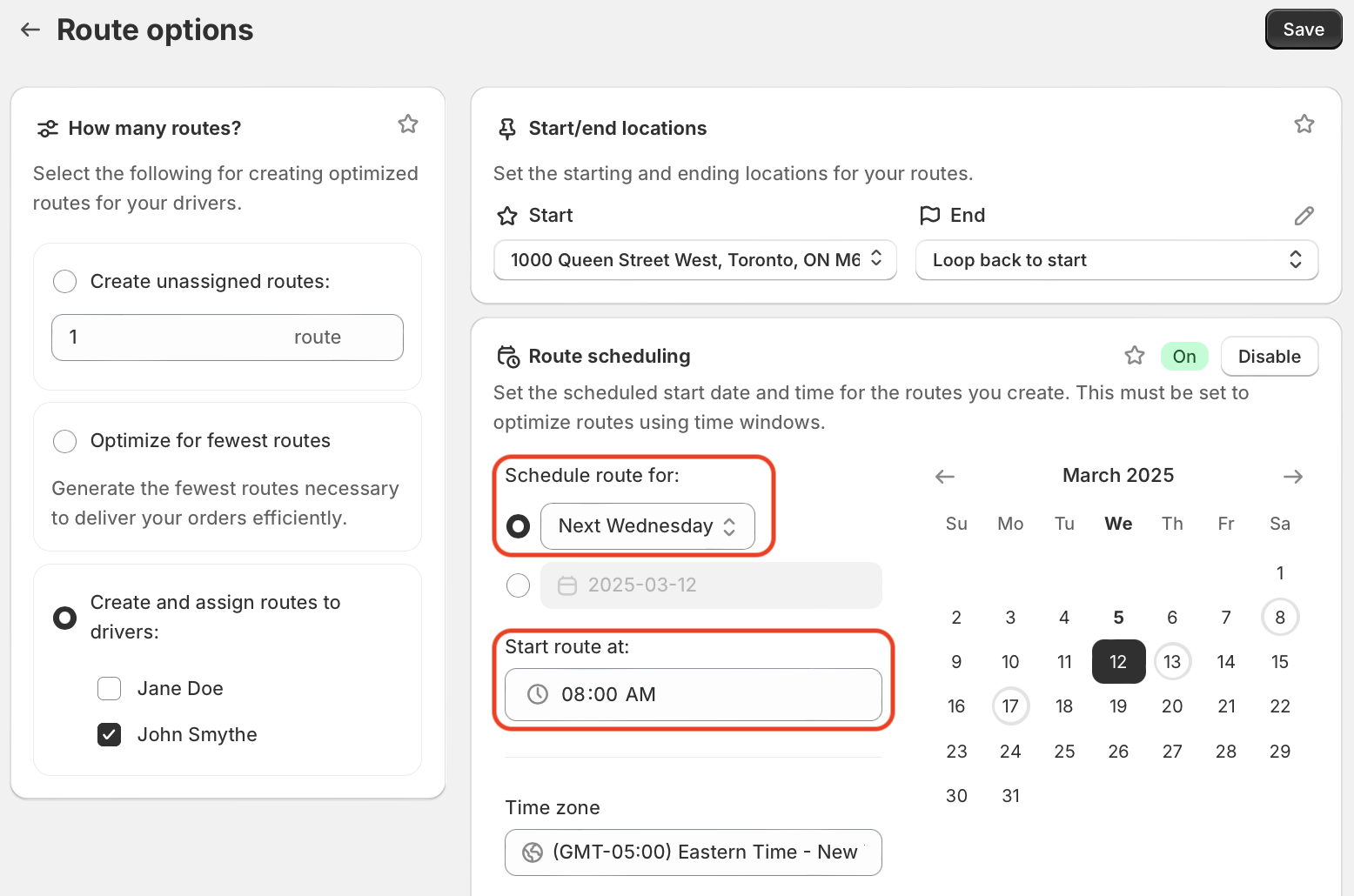 - Access the Route scheduling option from the list on the right-hand side of the page, and click the Enable button. Select "Next Wednesday" (or an alternate "Next" day of the week, depending on your delivery schedule) from the Schedule route for: dropdown, and select the time of day you'd like the route to begin: