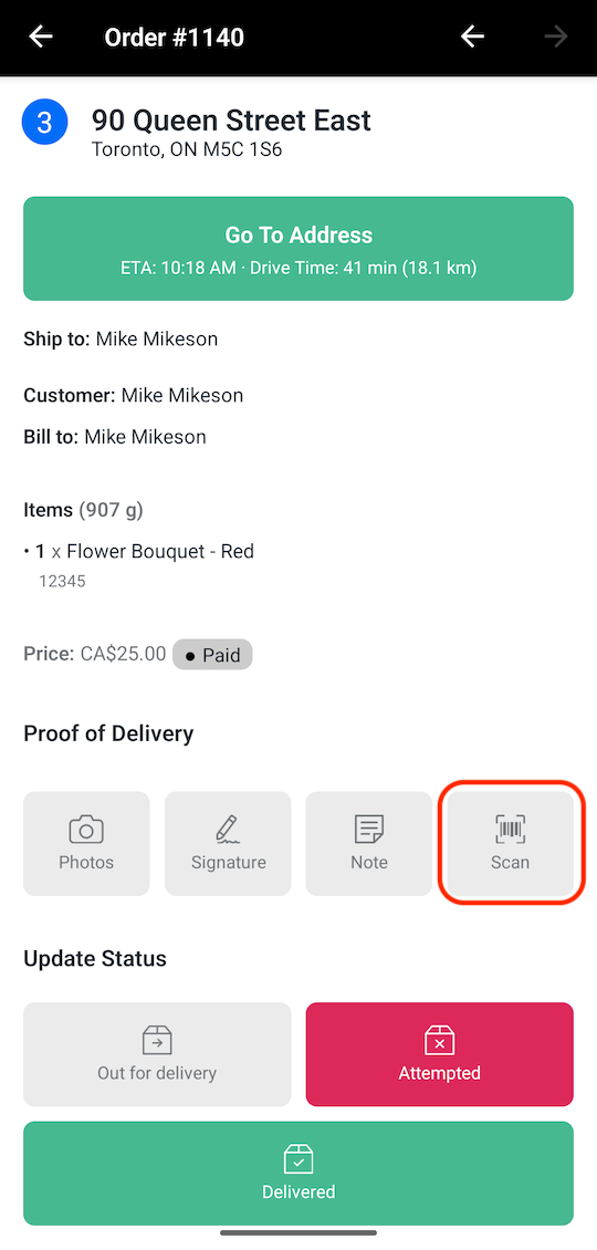 Barcodes generated by EasyRoutes and included on packing slips & packing labels can be scanned directly from the Proof of Delivery section of the mobile app when viewing an individual stop by tapping the Scan button: