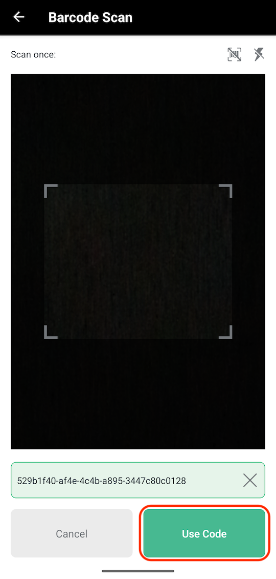 Tapping the Scan button will launch your mobile device's camera to scan a barcode - tap the Use code button that appears once a barcode is scanned to save this code to the stop's data: