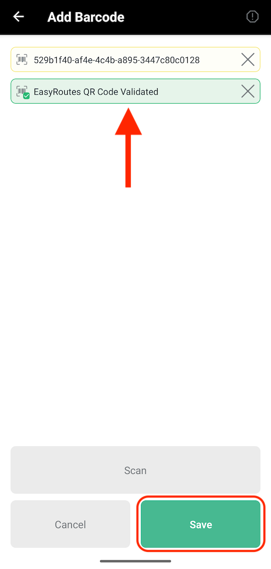 Once scanned, the Add Barcode page will also display any non-matching barcodes scanned in yellow - tap the Save button to confirm all barcodes scanned and return to the stop details page: