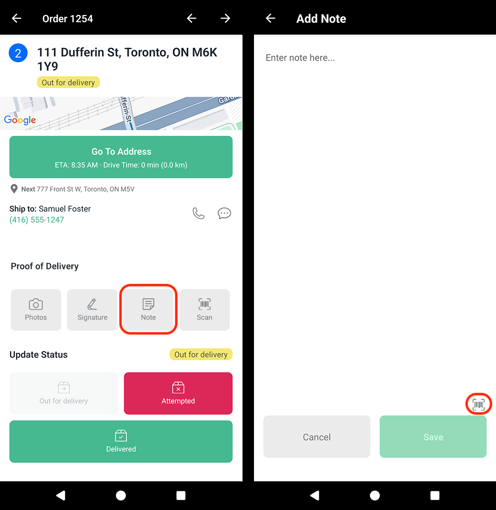 Drivers can tap the Note button from the Proof of Delivery section for any stop - a barcode scanner icon will appear in the lower right-hand corner of the Add note dialog, which, when tapped, will launch the mobile device's camera to scan any barcodes: