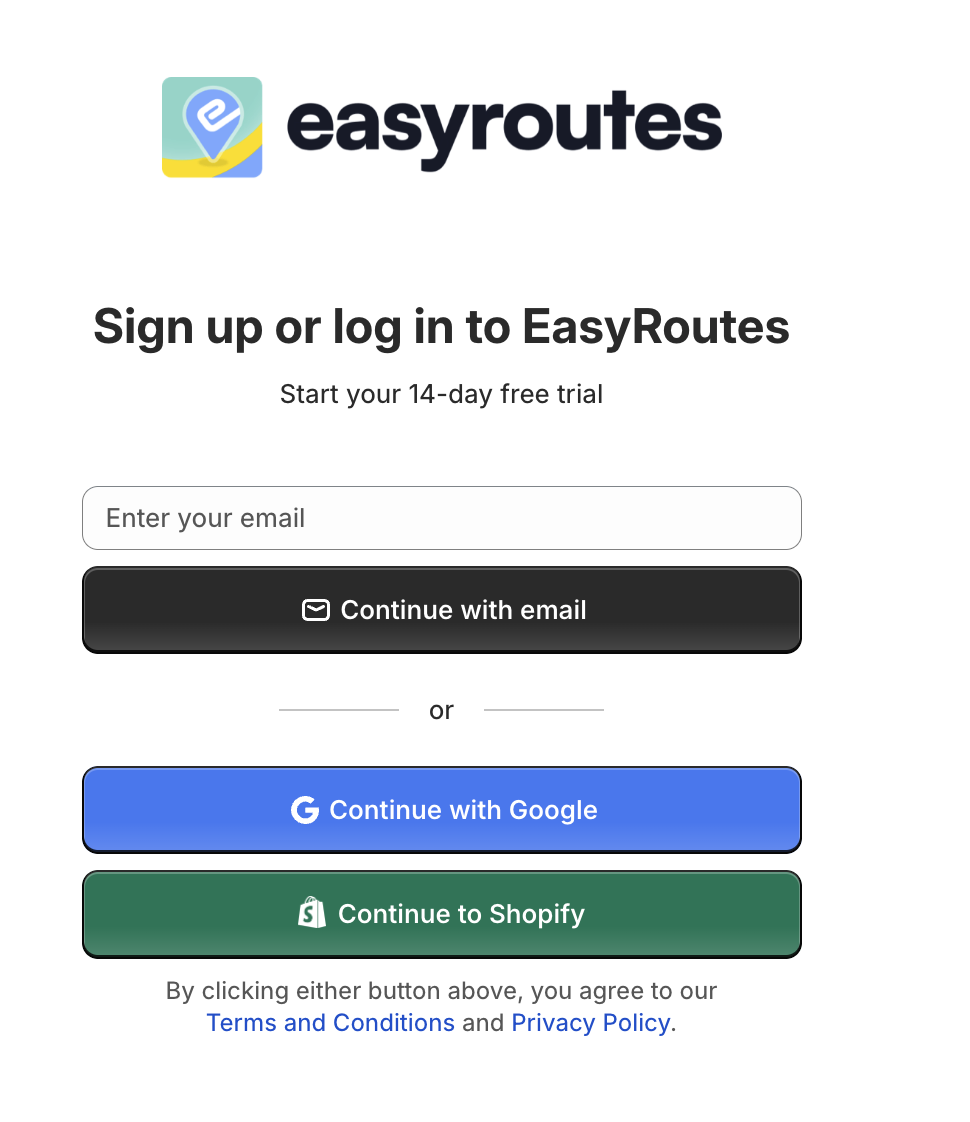 EasyRoutes for Web can be accessed via any web browser window from the EasyRoutes for Web homepage. You will have the option to log in with your email or a Google account. If you’ve created an account or logged in with a magic link in the past, you can also use the Google login option to access your existing account, as long as the same email address is used to sign in with each method. You can also click the ‘Continue to Shopify’ button to access EasyRoutes from the Shopify App Store.