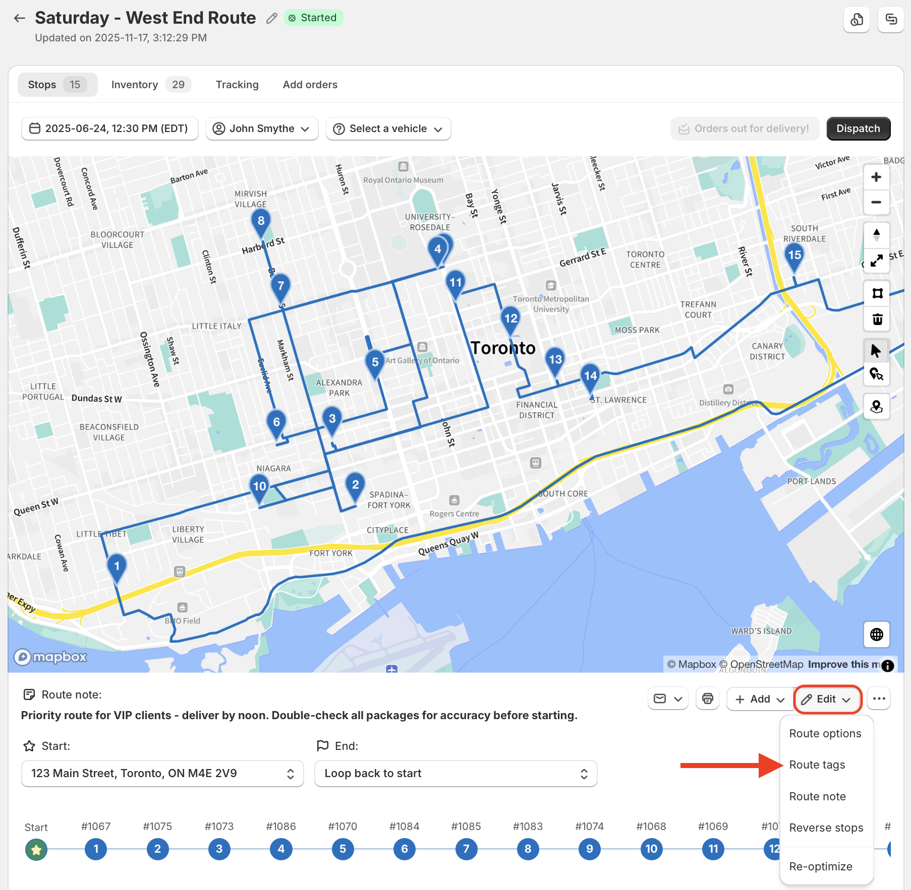 Route tags can be applied to categorize routes, improve filtering behaviour when finding specific types of routes, or to split out detailed Analytics reports by specific criteria, depending on your delivery workflows. Use tags to classify routes by vehicle type, service standard, geographical area, or any other metric useful to your operations - the sky's the limit!