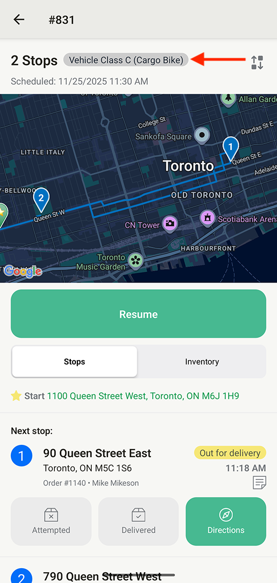 Drivers can also access route tags (along with route notes, if applicable) within the Delivery Driver mobile app (version 1.0.62 or above required), at the top of any route's summary page: