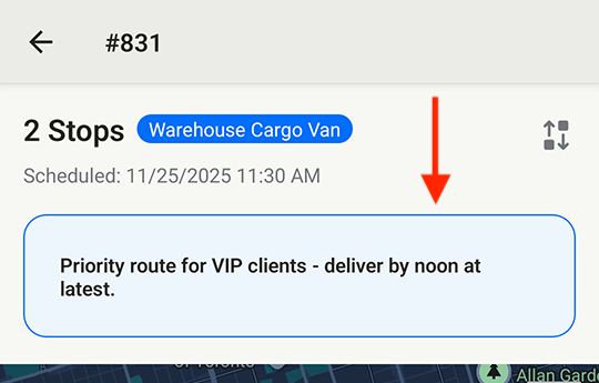 Drivers can also access route notes (along with route tags, if applicable) within the Delivery Driver mobile app (version 1.0.62 or above required), at the top of any route's summary page: