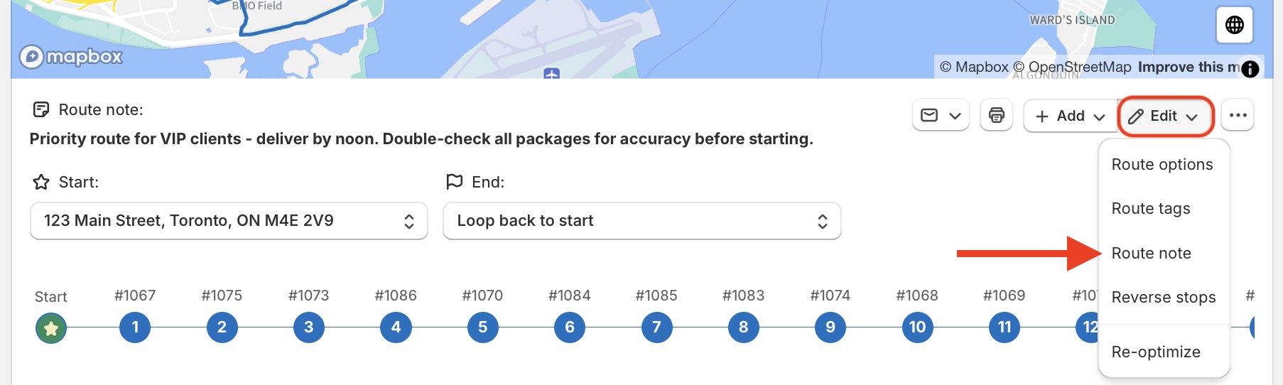 Route notes can be added from the Routes page, first using the checkboxes to select which route(s) you'd like to apply a note to. From the menu that appears at the bottom of the page, click into the More actions menu (three dots icon), and select Add note: