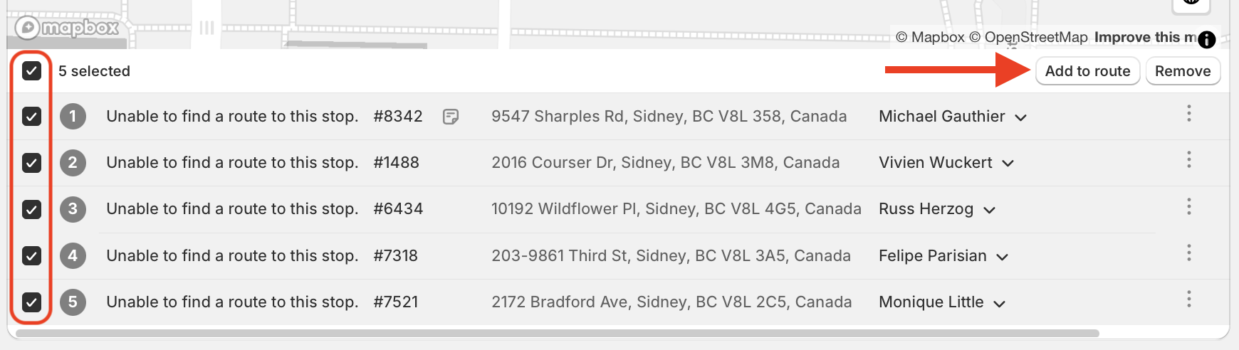 - On the Unrouted stops tab, scroll down below the map. Use the checkboxes to select all the rejected stops, and click the Add to route button that appears in the upper right-hand corner of the table: