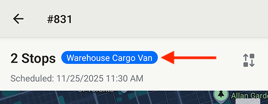 Whenever a vehicle has been assigned to a dispatched route, it will display at the top of the route summary page on the Delivery Driver mobile app: