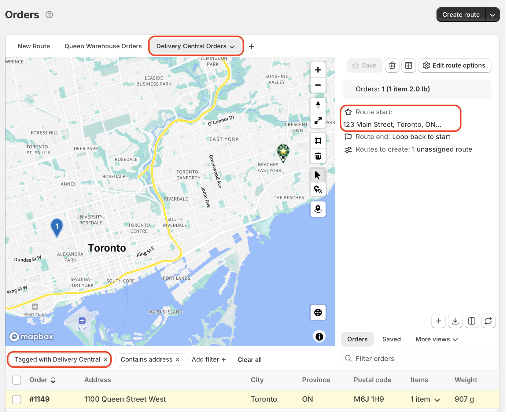 A new tab will be added to the top of your Orders page - click into this tab to apply the tag filter and set the route's starting location to the store address as configured above:
