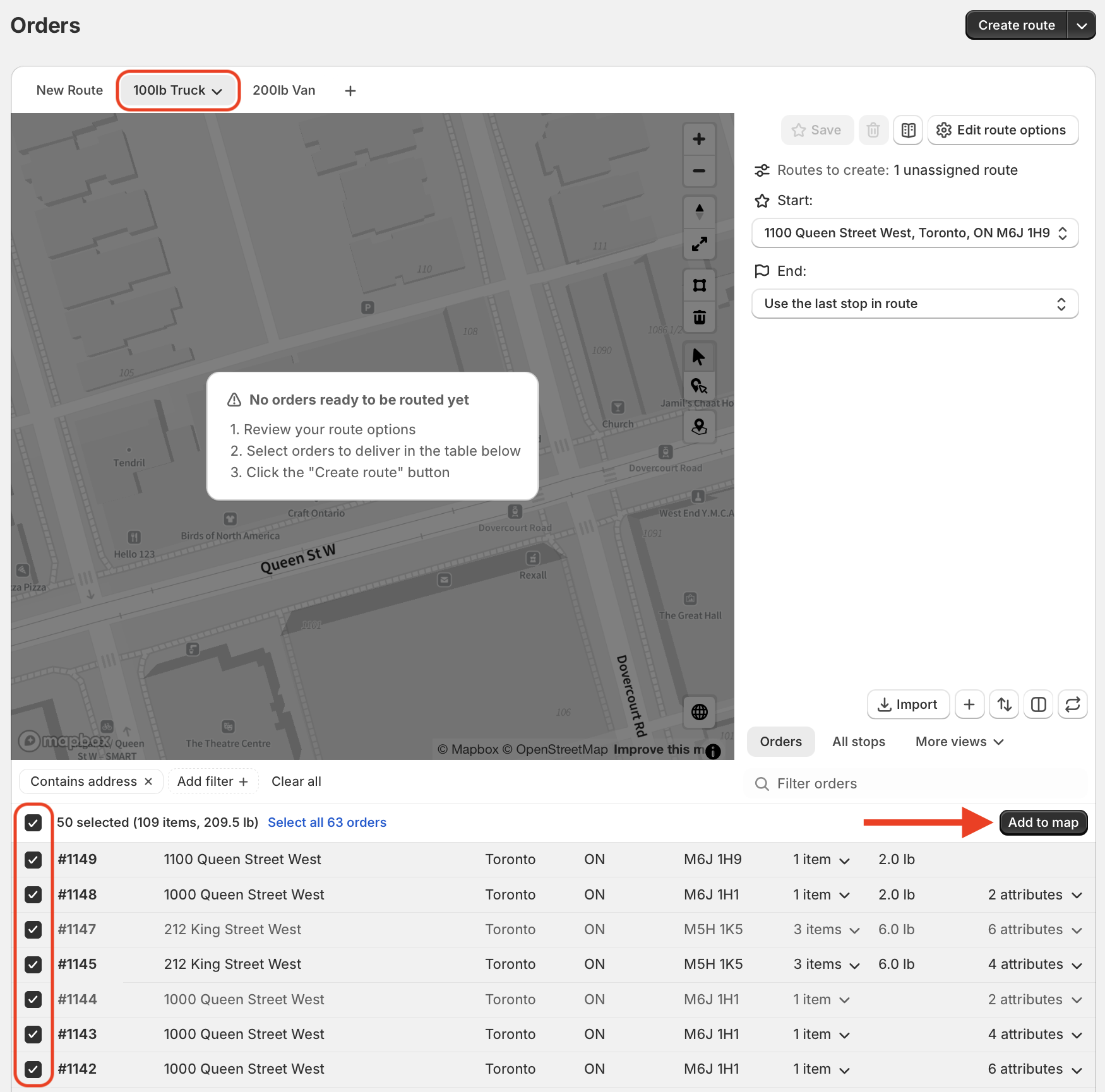 When planning a future route, click into the saved view tab configured with the weight limit you'd like to apply to your route - in this case, we'll plan a route for our 100lb capacity truck. Use the checkboxes to select the orders you'd like to route, and click the Add orders to map button that appears in the upper right-hand corner of the table: