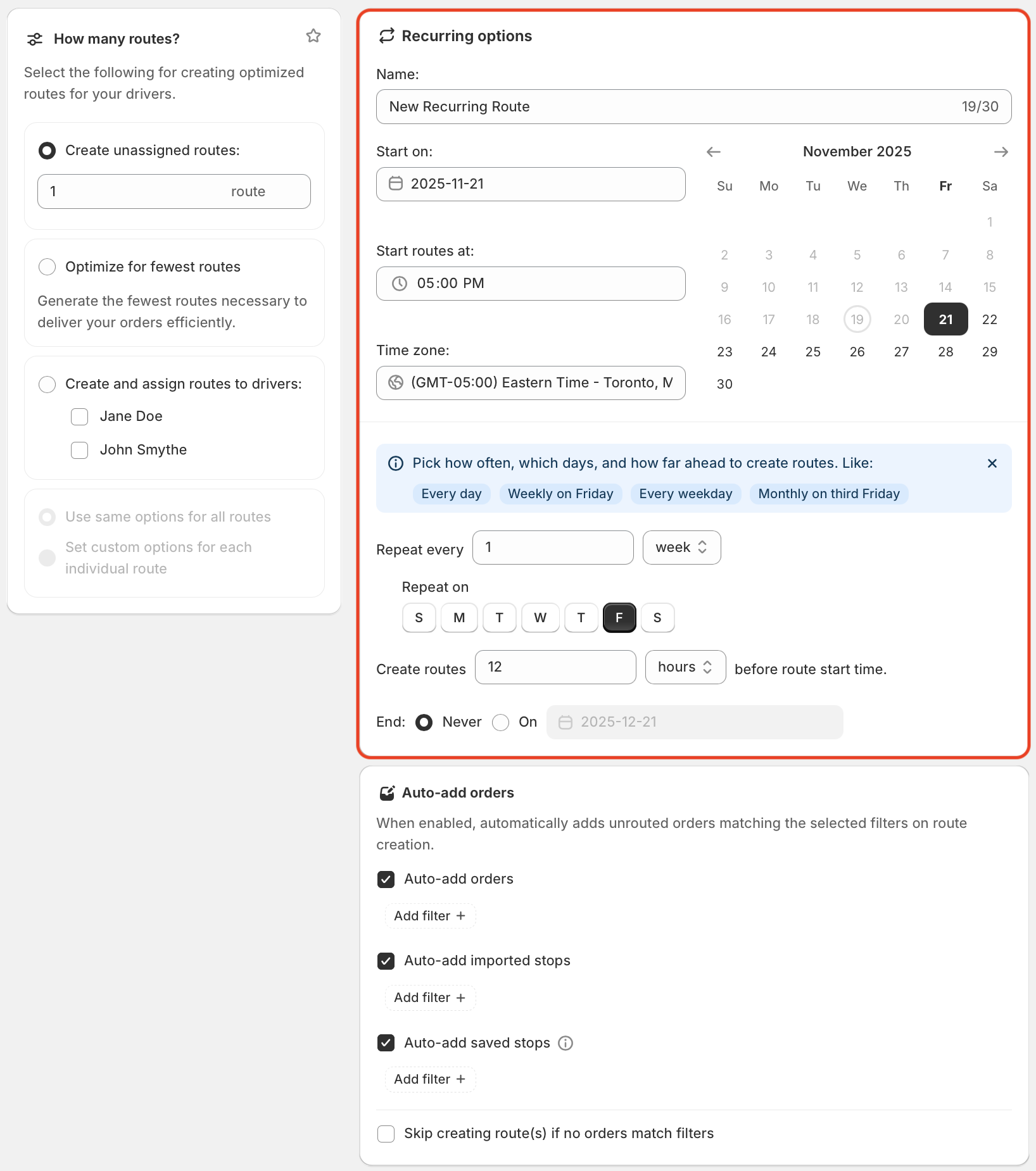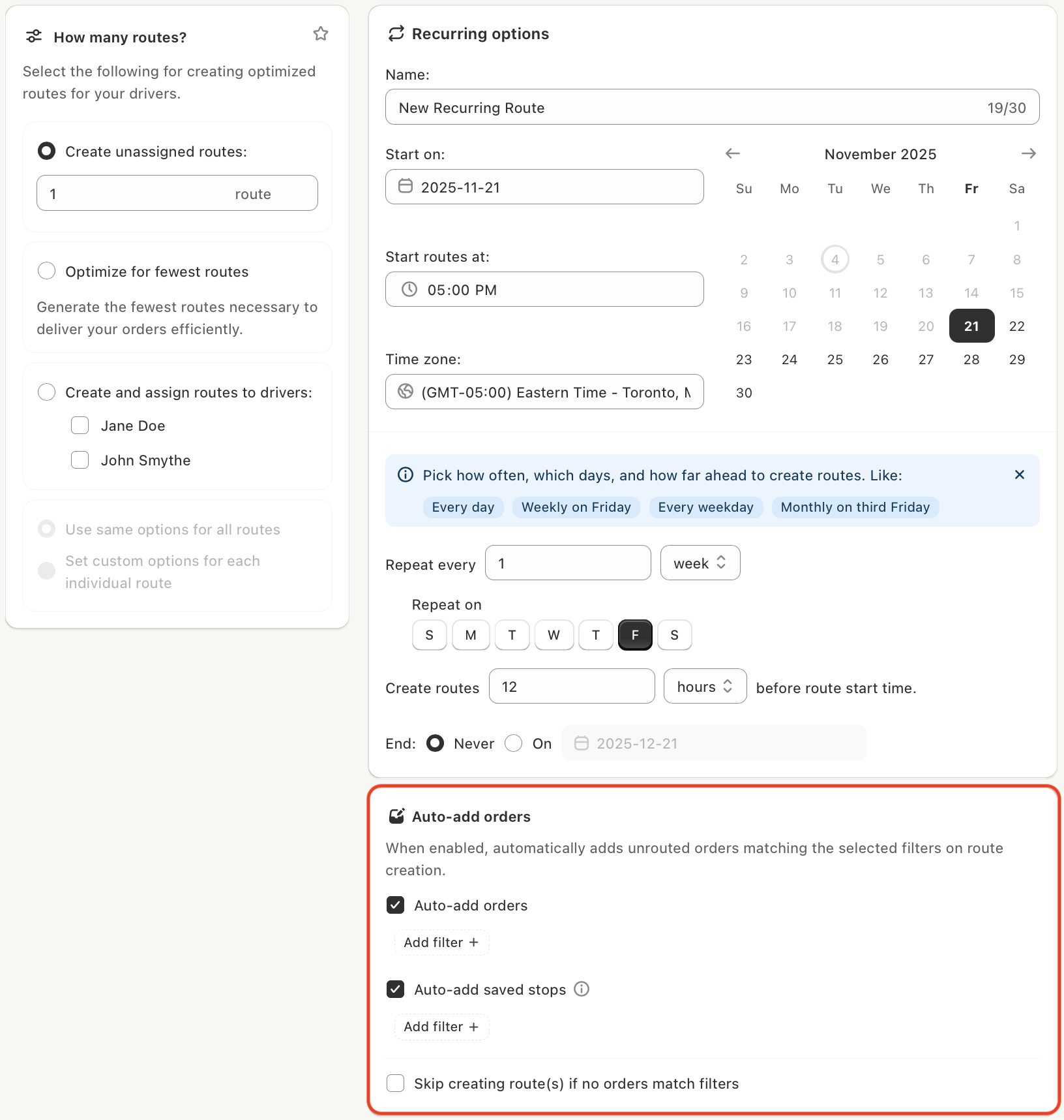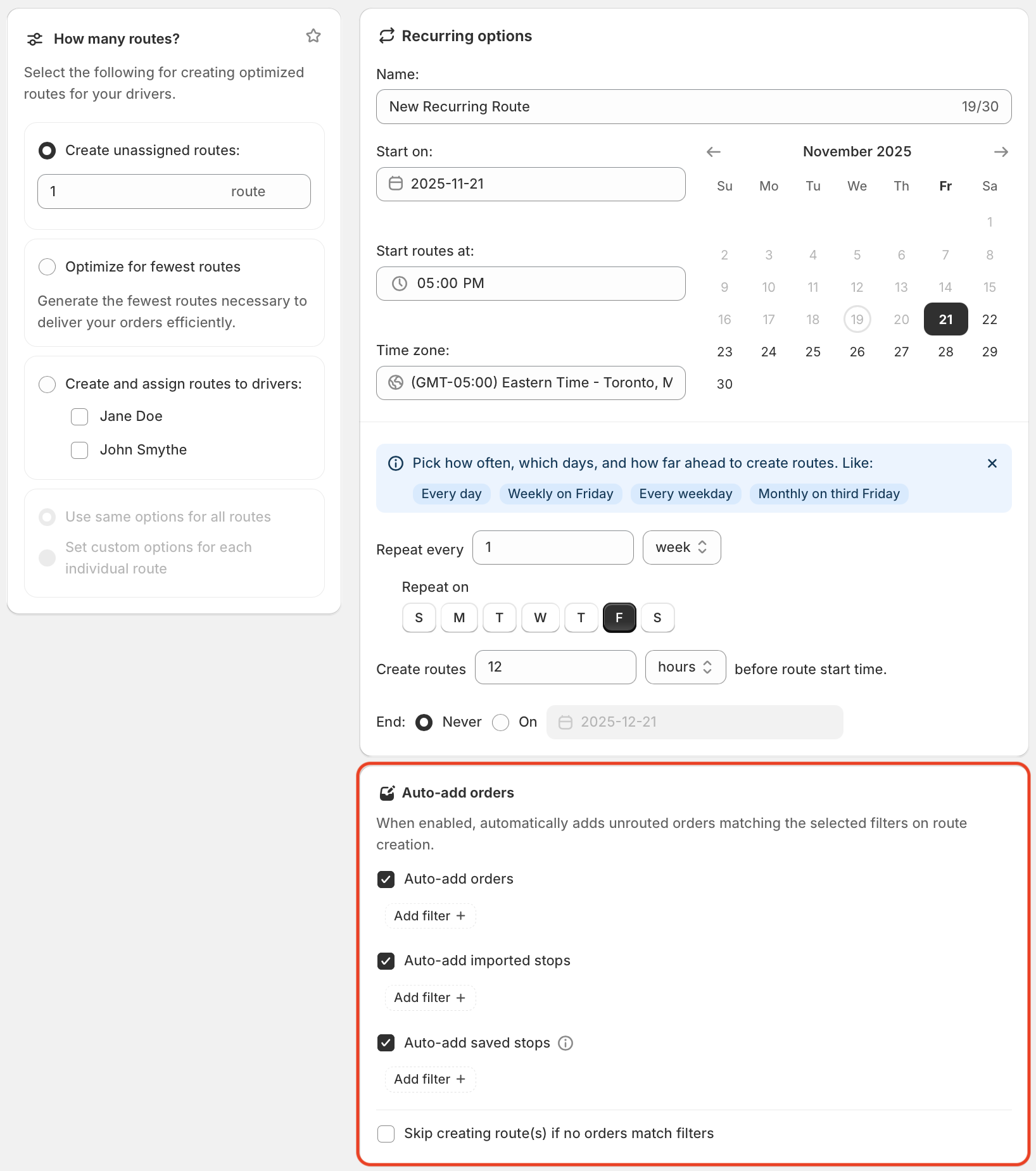 - Optionally enable Auto-add orders to automatically add any unrouted custom or imported stops to the route when it is created. Select from the Add filter menu to further fine-tune which unrouted custom or imported stops should be added.