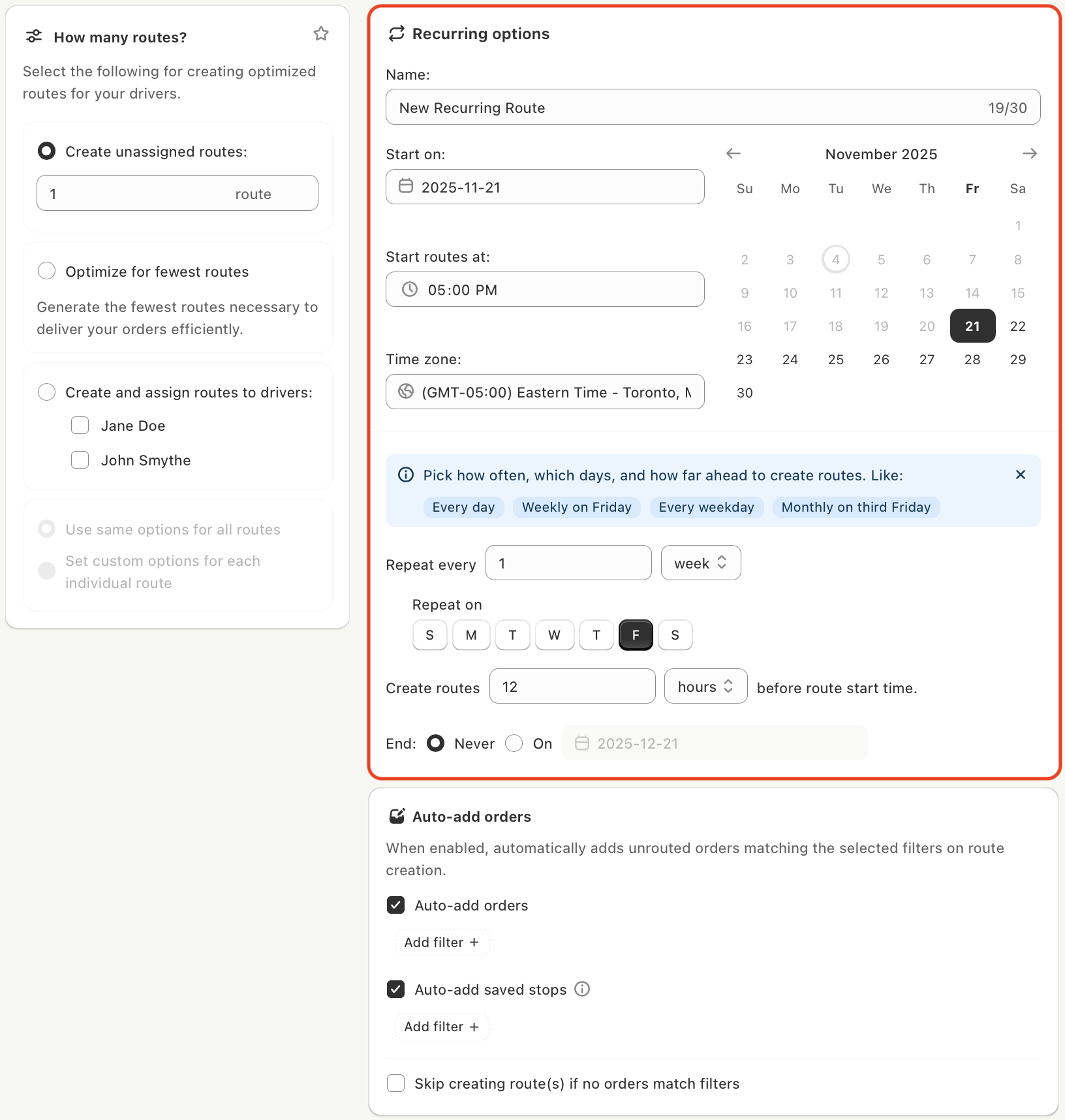 - Repeat every: The frequency of when this workflow will create routes - input a custom number, and choose from day, week, or month options, depending on your route planning needs: