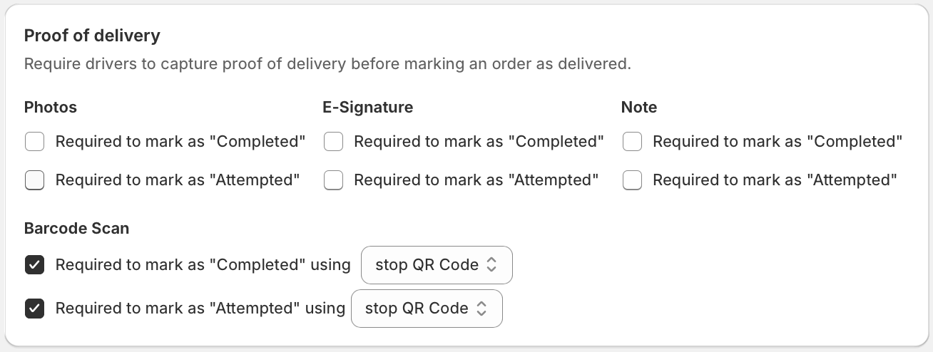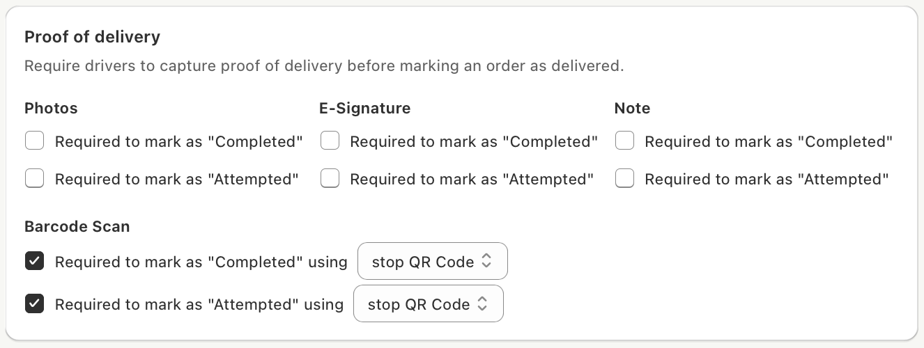 Use the checkboxes in this section to configure whether each type of proof of delivery (Photo(s), E-Signature, Driver Note, and/or Barcode Scan) are required to mark a stop as Completed and/or Attempted.