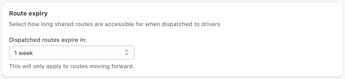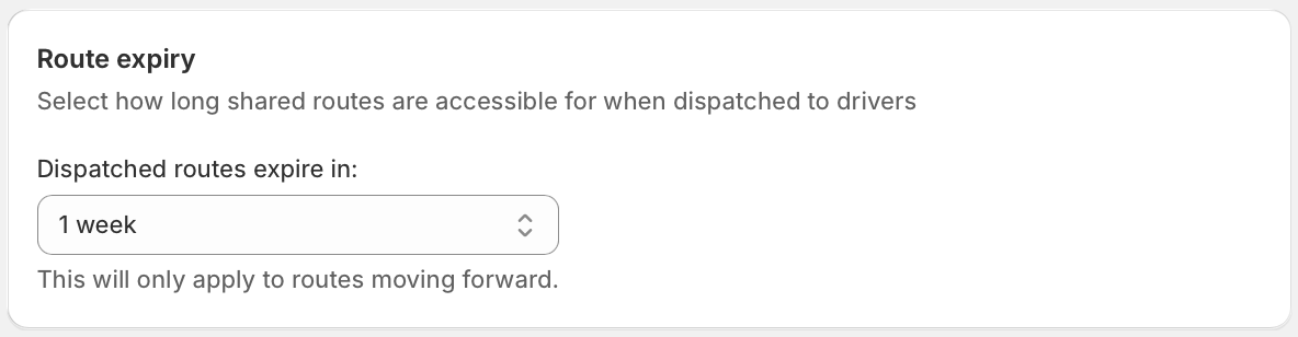 Select from the dropdown here to determine how long your drivers will have access to routes after they are dispatched to them - 24 hours, 48 hours, 72 hours, 1 week, 2 weeks, or 4 weeks. This setting will apply for any routes dispatched in the future (i.e. it will not affect routes that have been dispatched prior to updating this setting):
