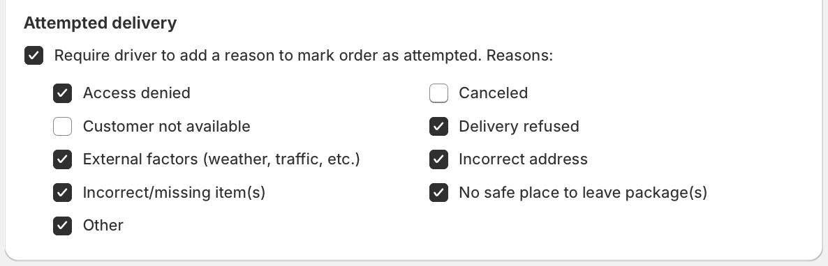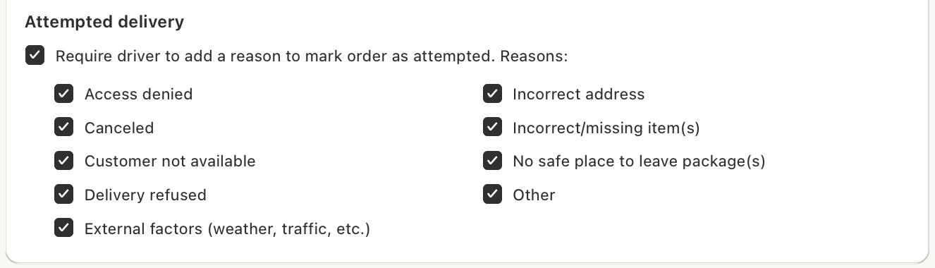 Enable the Require driver to add a reason to mark an order as attempted setting to ensure drivers must include a reason before being able to successfully mark an order as attempted. Each of the checkboxes below this can be disabled to remove individual preset options that drivers can select from as an attempted delivery reason: