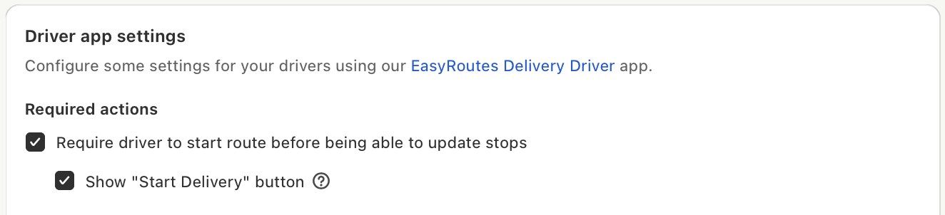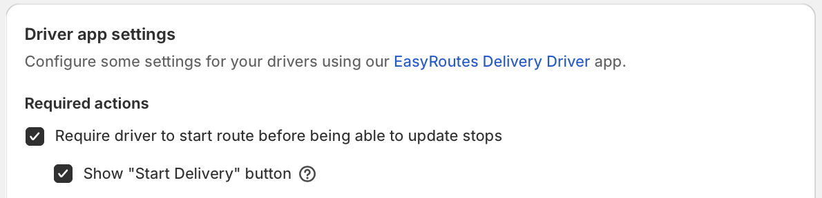 - Require driver to start route before being able to update stops: Enable this setting to ensure that drivers must start a route before they can apply updates to any stops - particularly useful if you've enabled "Out for Delivery" customer notifications, which are triggered by a route being started. This setting will only be available to enable if the one below it is also enabled.