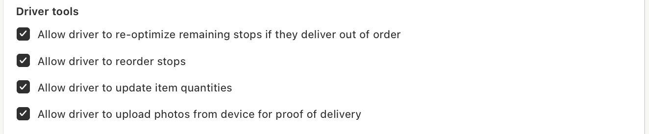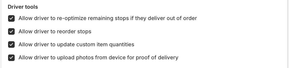 Settings in this section control what additional tools/options will be made available for drivers when completing their routes: