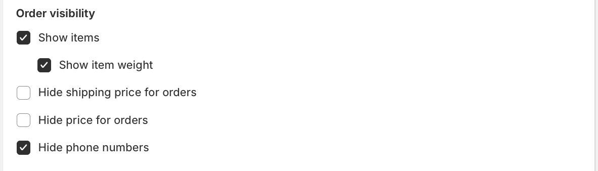 - Hide phone numbers: When enabled, customer phone numbers will not be displayed to drivers using the mobile app.