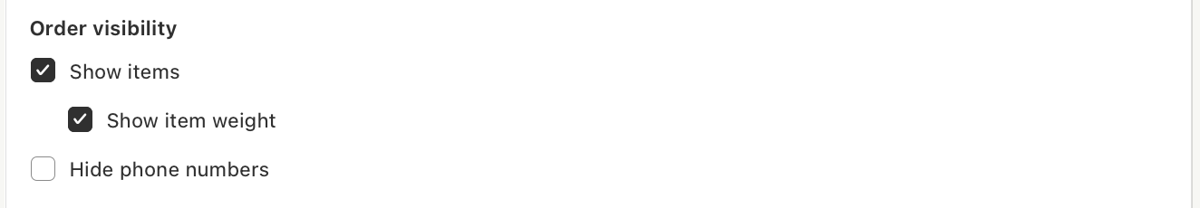 - Show items: When enabled, shows the details of any items contained for an order/stop within the mobile app.