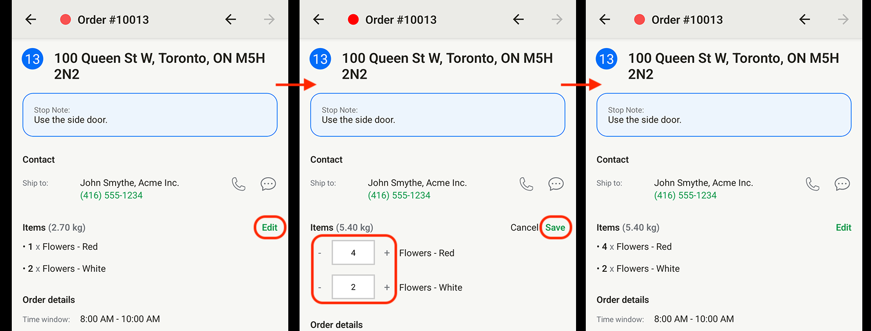 - Tap the Save button to see updated item quantities reflected in the stop, as shown below: