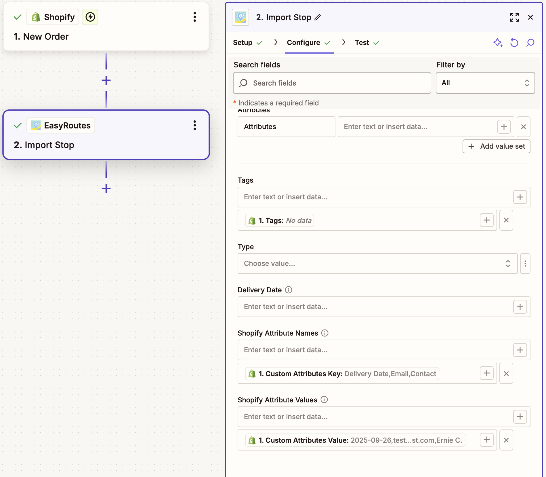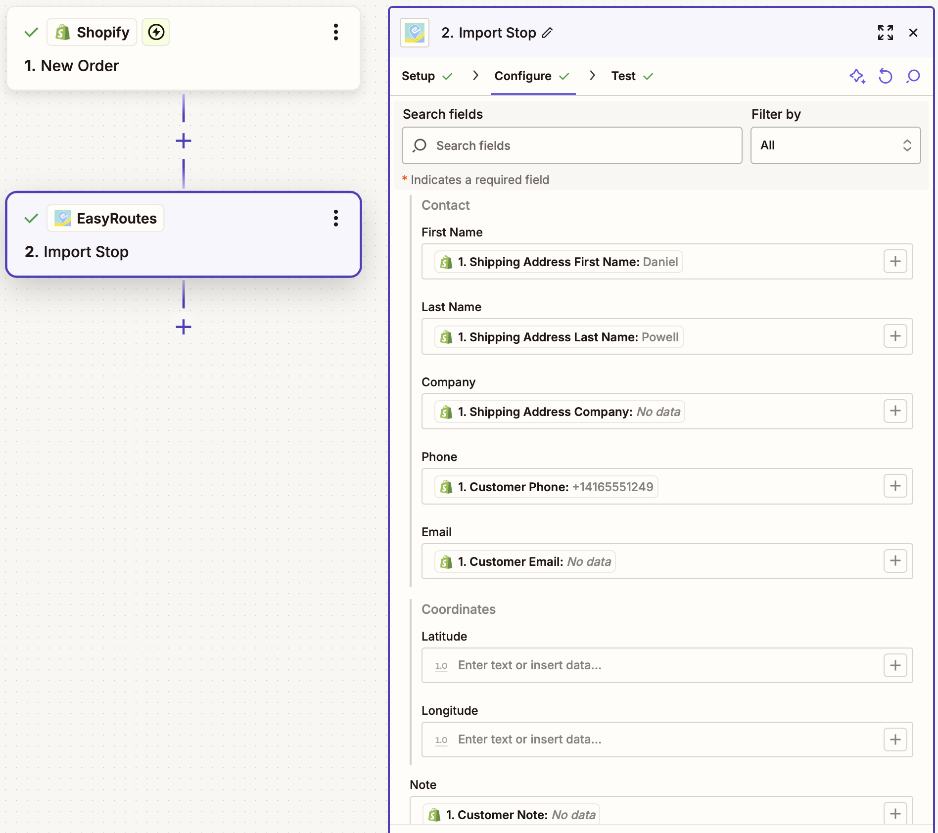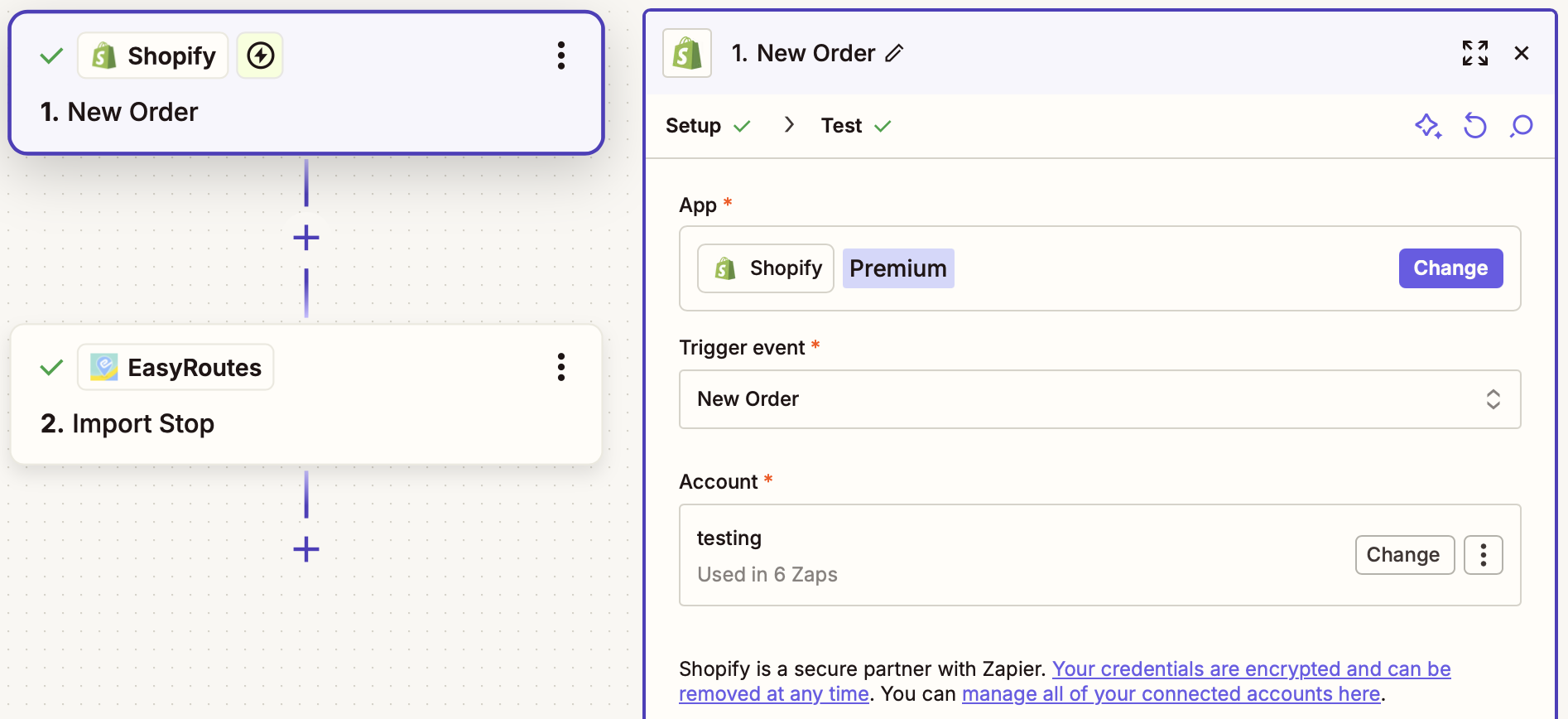 This Zapier integration watches for new Shopify orders, then imports selected order details as a custom stop in EasyRoutes. Use this style of Zap to import Shopify orders into EasyRoutes for Web, or to connect multiple Shopify stores to a single EasyRoutes installation.