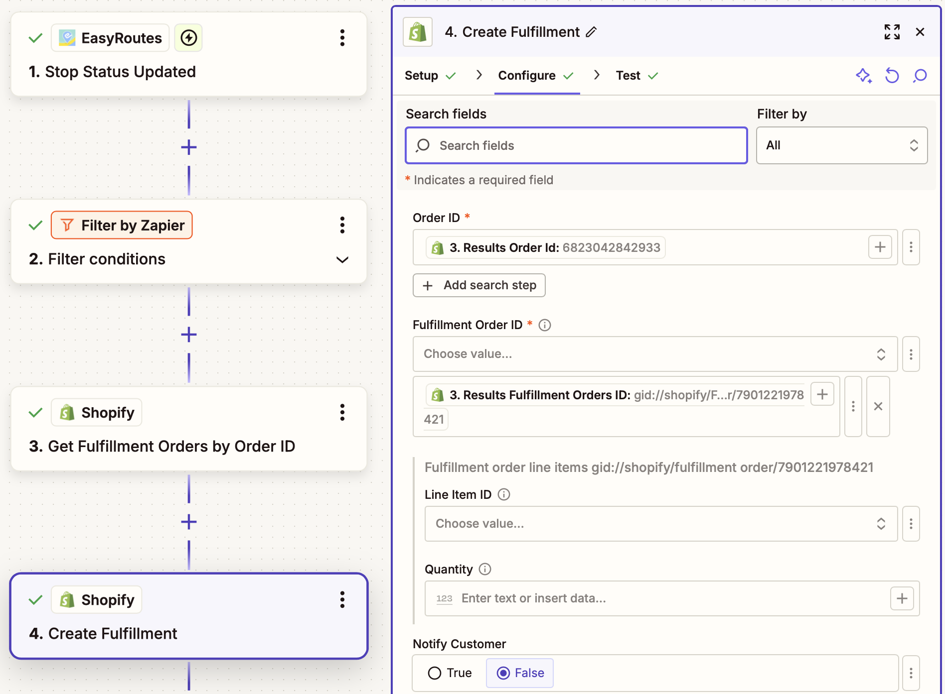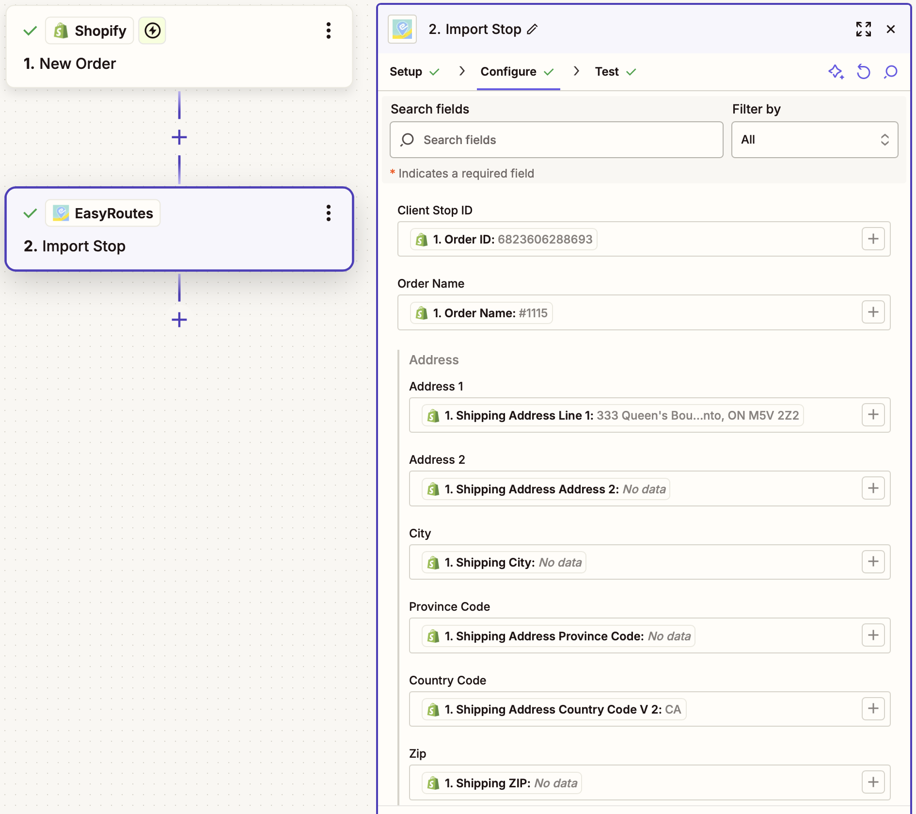 - This Zap requires access to the Shopify Order ID of the order that will be updated so the correct order can be looked up before updating. Order lookup via alternate methods (customer name, order number, etc.) are also possible, but will require additional customization. In the example below, we've stored the Shopify Order ID in EasyRoutes' Client Stop ID field when importing the stop, and can reference it using that variable again now.
