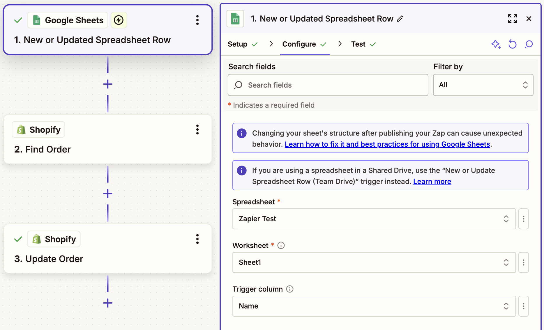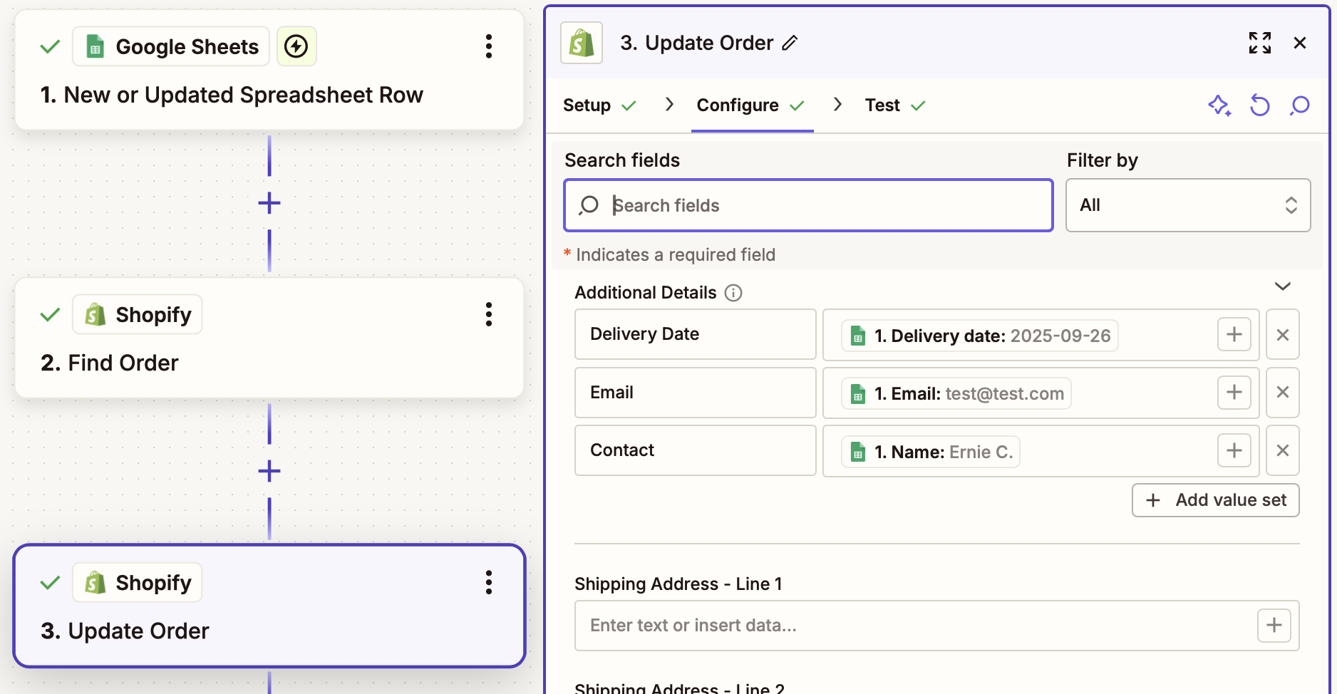 The fields on the Configure panel are based on the headers in the spreadsheet. You can select values based on the fields from the previously-selected webhook record above.