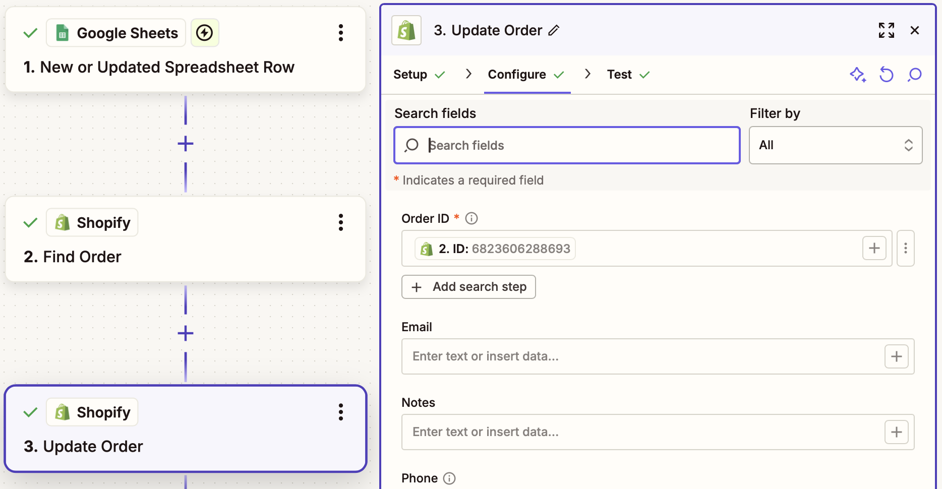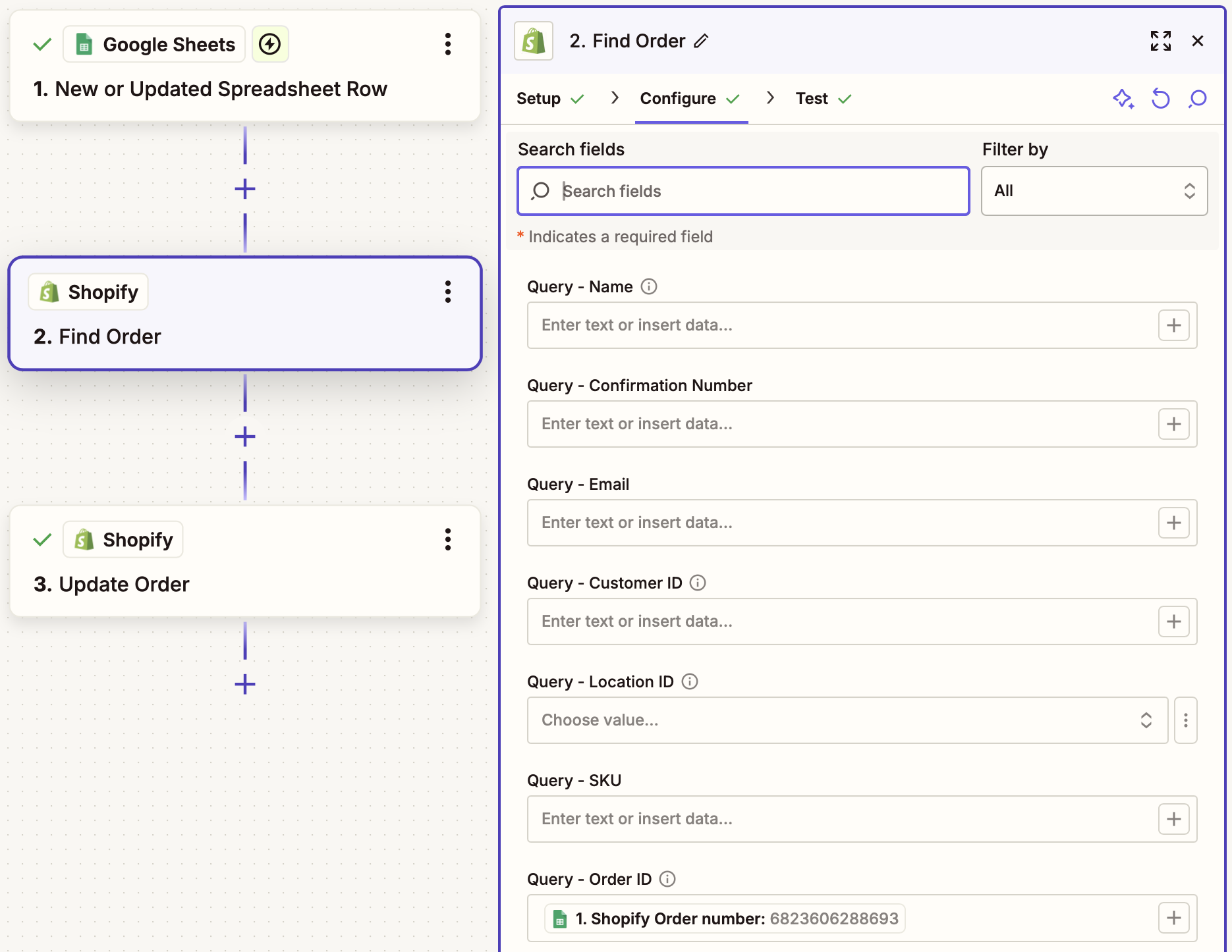 - This Zap requires access to the Shopify Order ID of the order that will be updated so the correct order can be looked up before updating - in Step 2, we use this for the Query - Order ID field when looking up matching orders. Order lookup via alternate methods (customer name, order number, etc.) are also possible, but will require additional customization.
