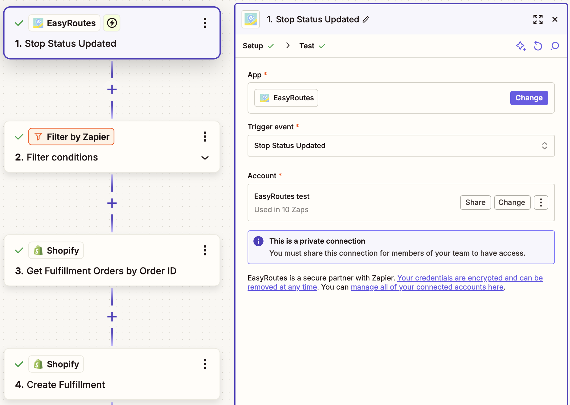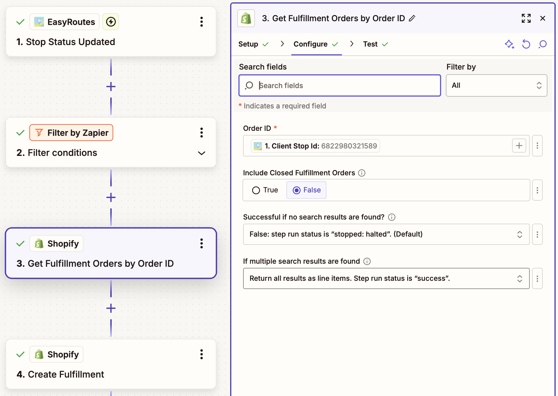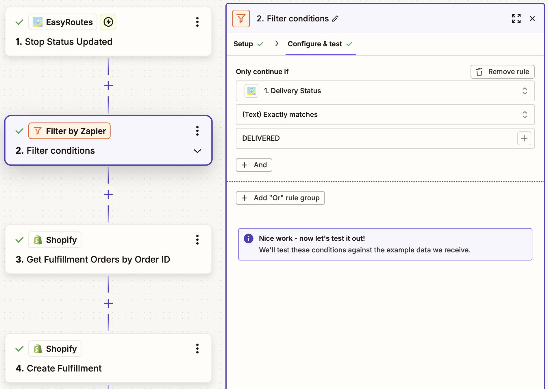 This Zapier integration watches for status updates for an EasyRoutes stop, filters to check whether a specific status has been applied (in this case, Delivered), then looks up the stop's corresponding Shopify order and marks it as fulfilled.