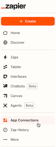 Once your EasyRoutes account has been granted API access, login to your Zapier account, and select the App Connections item from the sidebar menu: