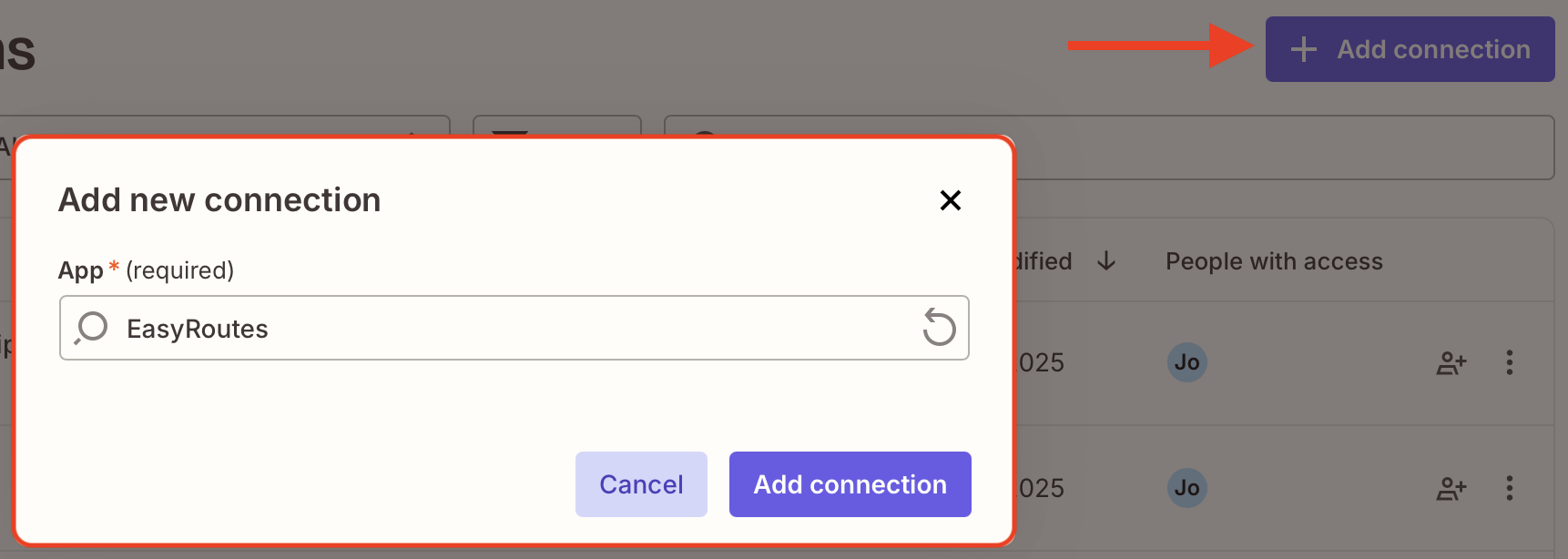 Click the Add connection button found in the upper right-hand corner of the page, type EasyRoutes into the App box, and click Add connection: