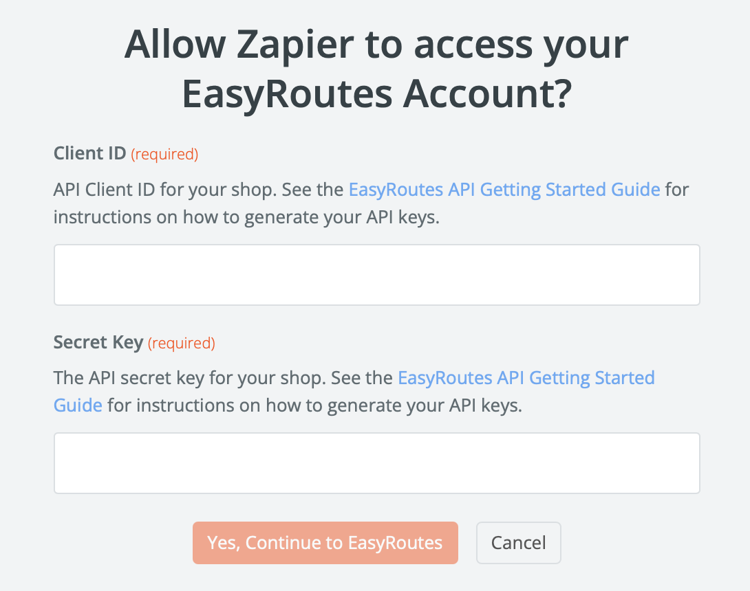 From the window that pops up, input your Client ID & Secret Key found in your EasyRoutes Settings > API Settings tab. Additional details on setting and accessing your Client ID / Secret Key can be found in this support article: