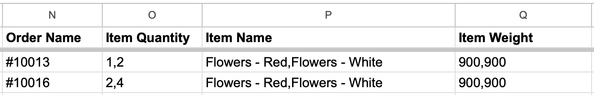 This means each order contains the following quantity of items, and their weights - we'll continue using Order #10013 with the example below, but the same process can be applied to any orders formatted in this manner: