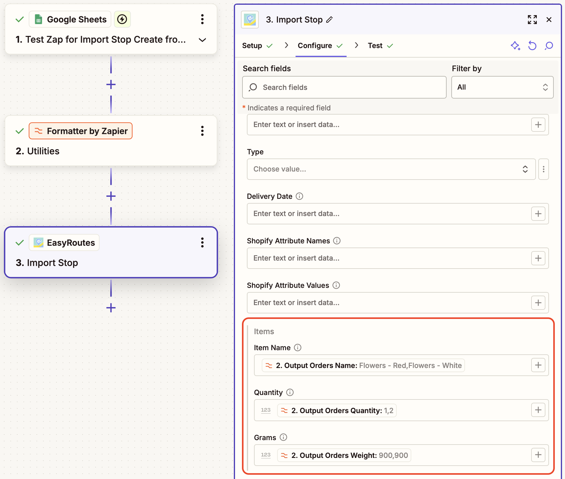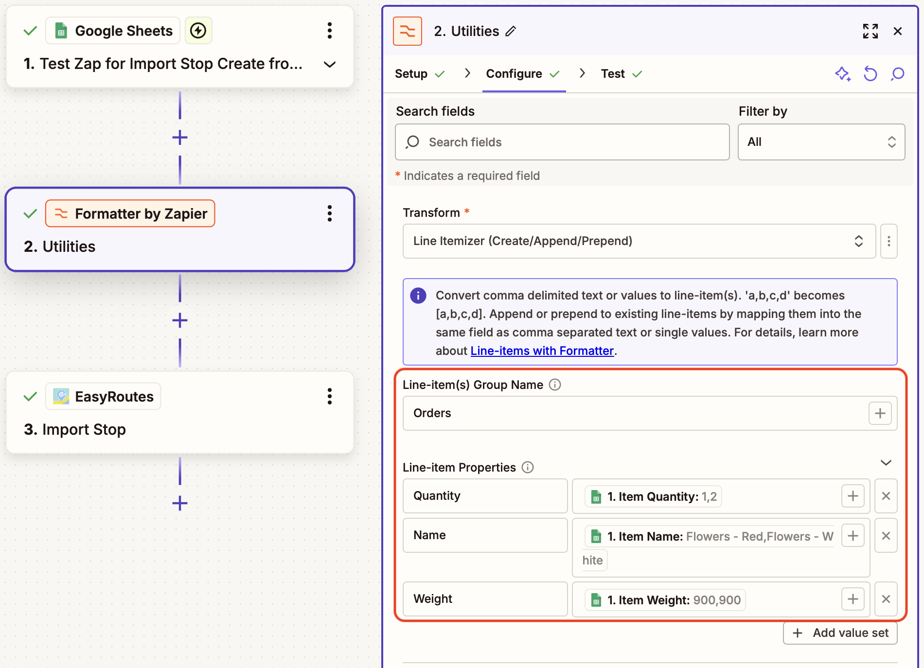 In order to properly import multi-item orders to EasyRoutes via Zapier, they will need to be formatted as line items (aka an array). Depending on the source of your orders, they may already be formatted as an array (for example, when importing directly from Shopify); if they're not (for example, when importing from a spreadsheet), an additional Zapier Formatter step will be required. Full details can be found in this Zapier support article, and a reference example is detailed below.