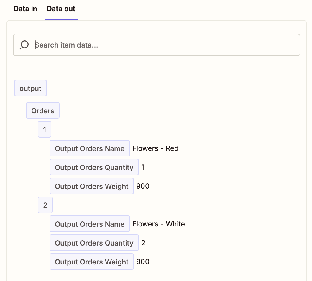 When mapping order line items in the Import Stop step, use the array output from the Formatter step to send this data to EasyRoutes as follows:
