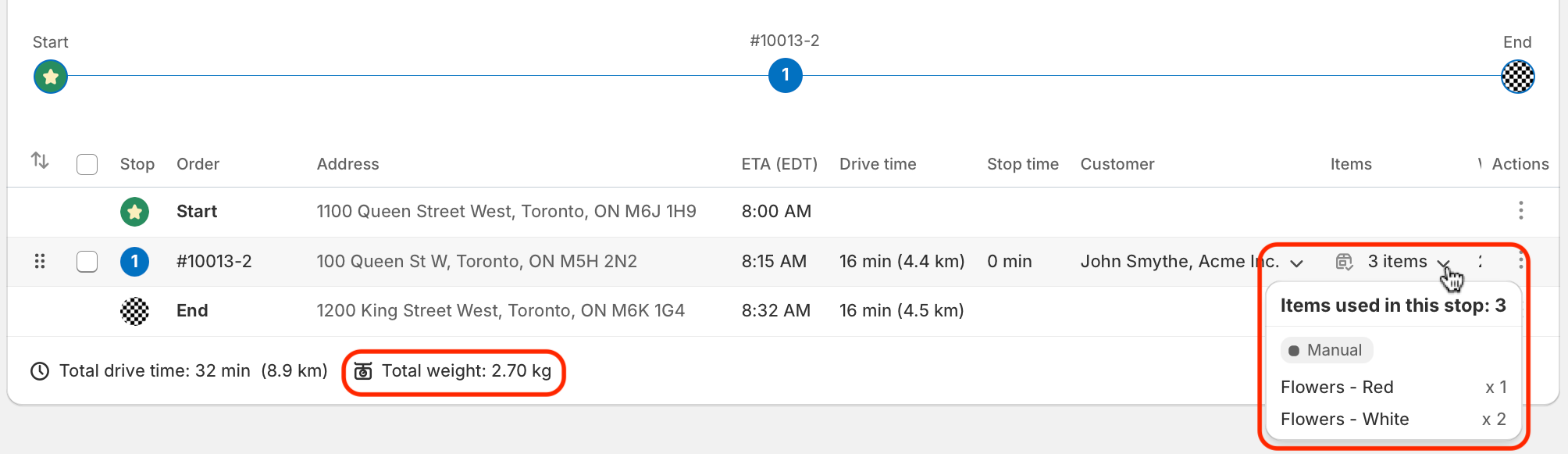 When imported to EasyRoutes as configured above, these items and their weights will now display accurately on any routes they're added to: