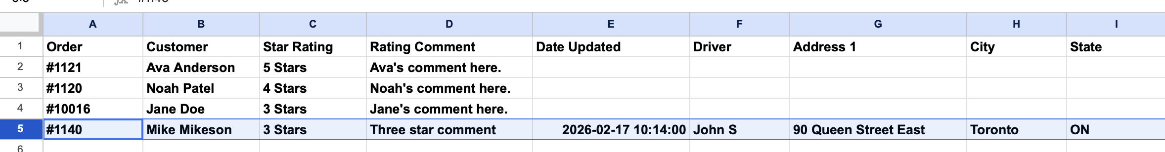 Using the steps and code above, this is what the result looks like in the updated spreadsheet, with new delivery ratings/comments being added to the sheet as long as the Zap is active: