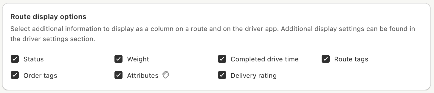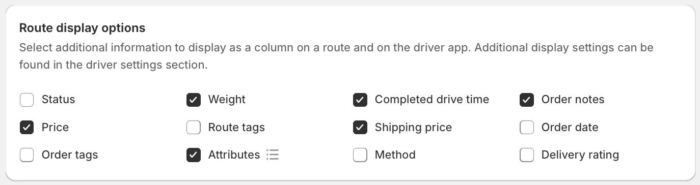 Use the checkboxes in this section to configure which additional information you want to display as a column on the route page and on the EasyRoutes Delivery Driver mobile app. Options include: