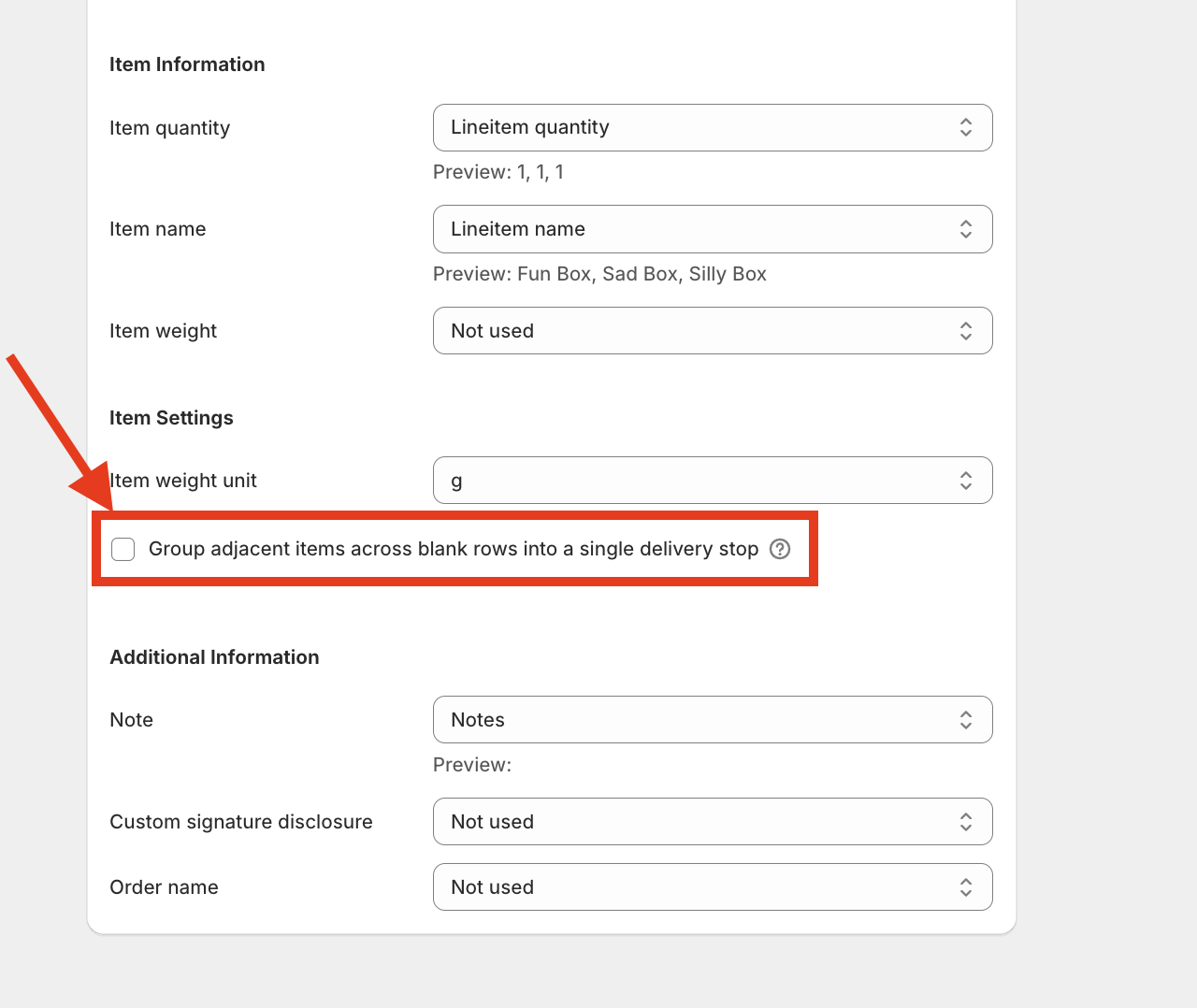 Select 'Edit stops' at the bottom-right of the window - Scroll down to the Item Settings section, and enable the Group adjacent items across blank rows into a single delivery stop checkbox:
