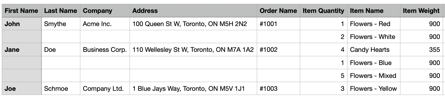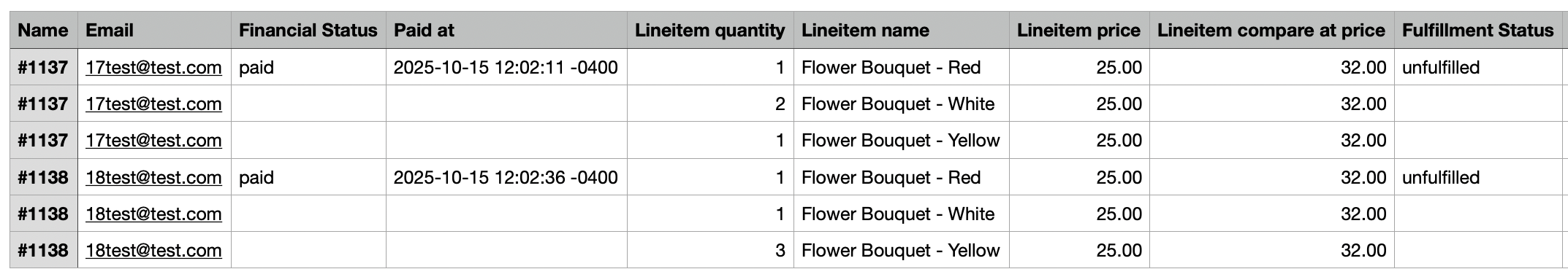 - Multiple items exported from Shopify: Similar to the above, EasyRoutes will parse multiple line items for orders exported using Shopify's default export formatting. As shown in the example below, both Order #1137 and Order #1138 will import three different types of items, even though each subsequent line also contains additional data like the order name and customer email address: