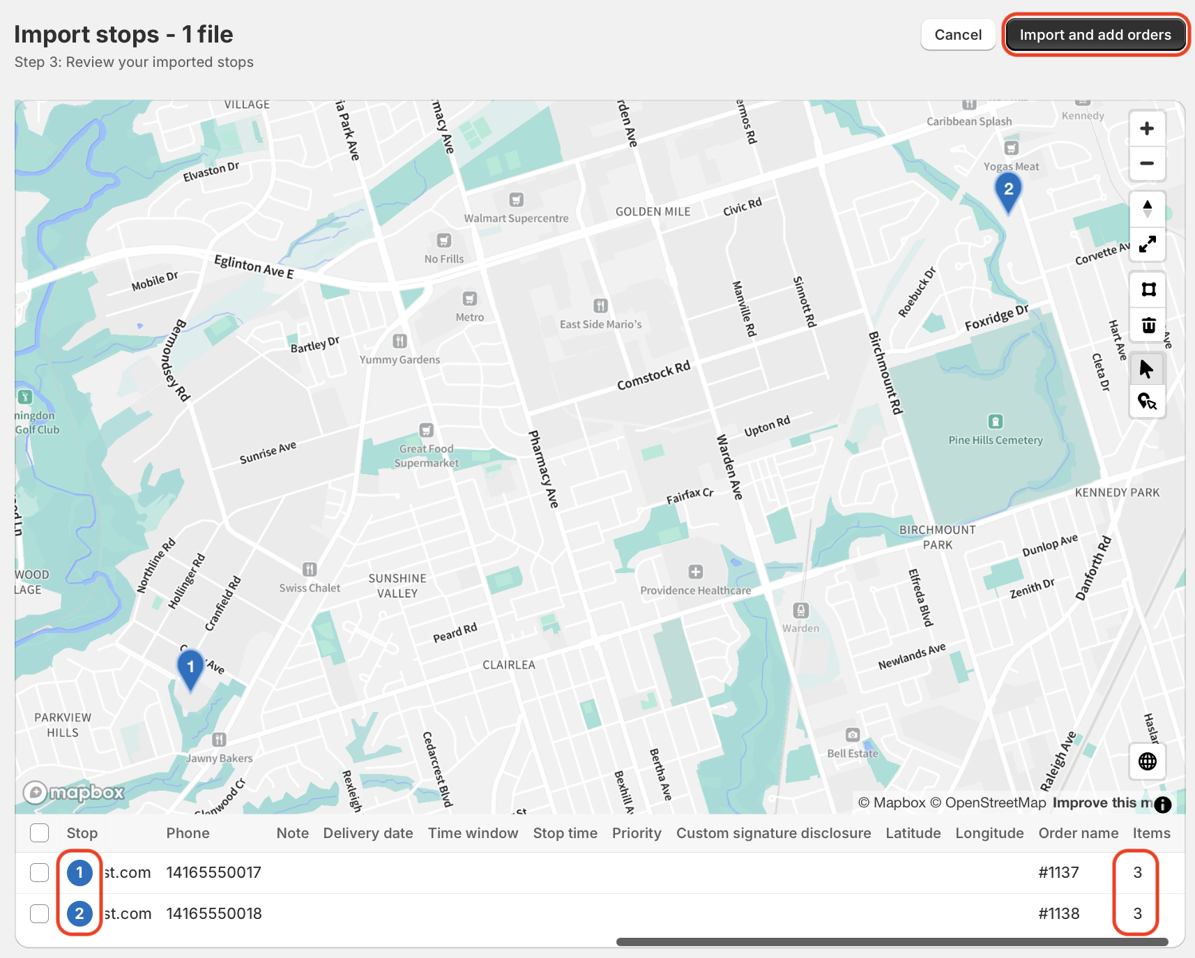 - Scroll back up to the top of the page, and click the Next button in the upper right-hand corner of the page. You should now see the proper number of stops and their respective number of items for review; click the Import and add orders button in the upper right-hand corner of the page to complete your CSV import: