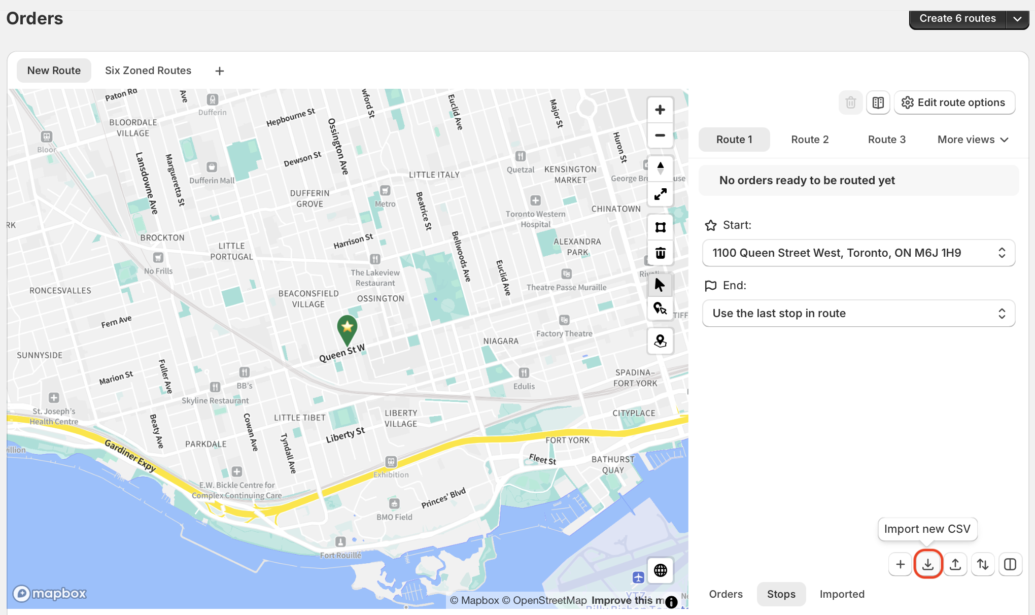 From your EasyRoutes Orders page, click the Import new CSV button: