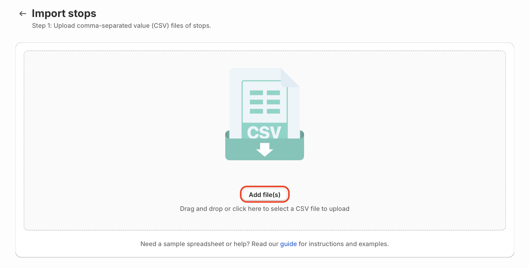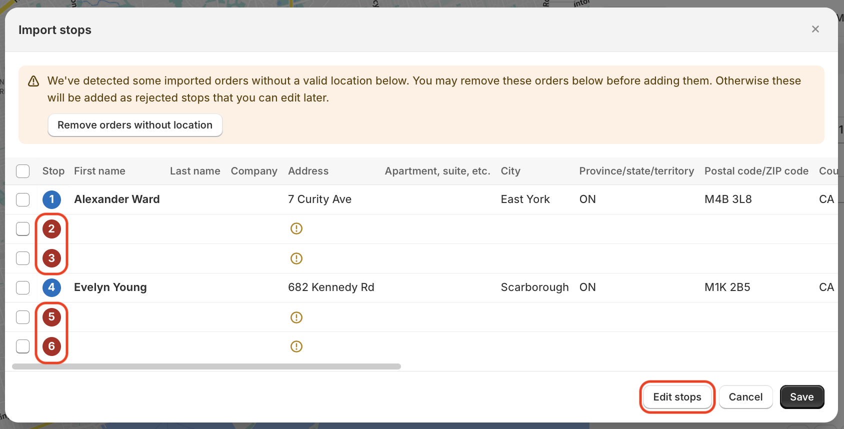 On the 'Import stops' window click on 'Add file(s)' and select your formatted CSV An error will initially display when attempting to parse the item lines as separate stops (like stops 2, 3, 5, and 6 shown below); click the Edit stops button: