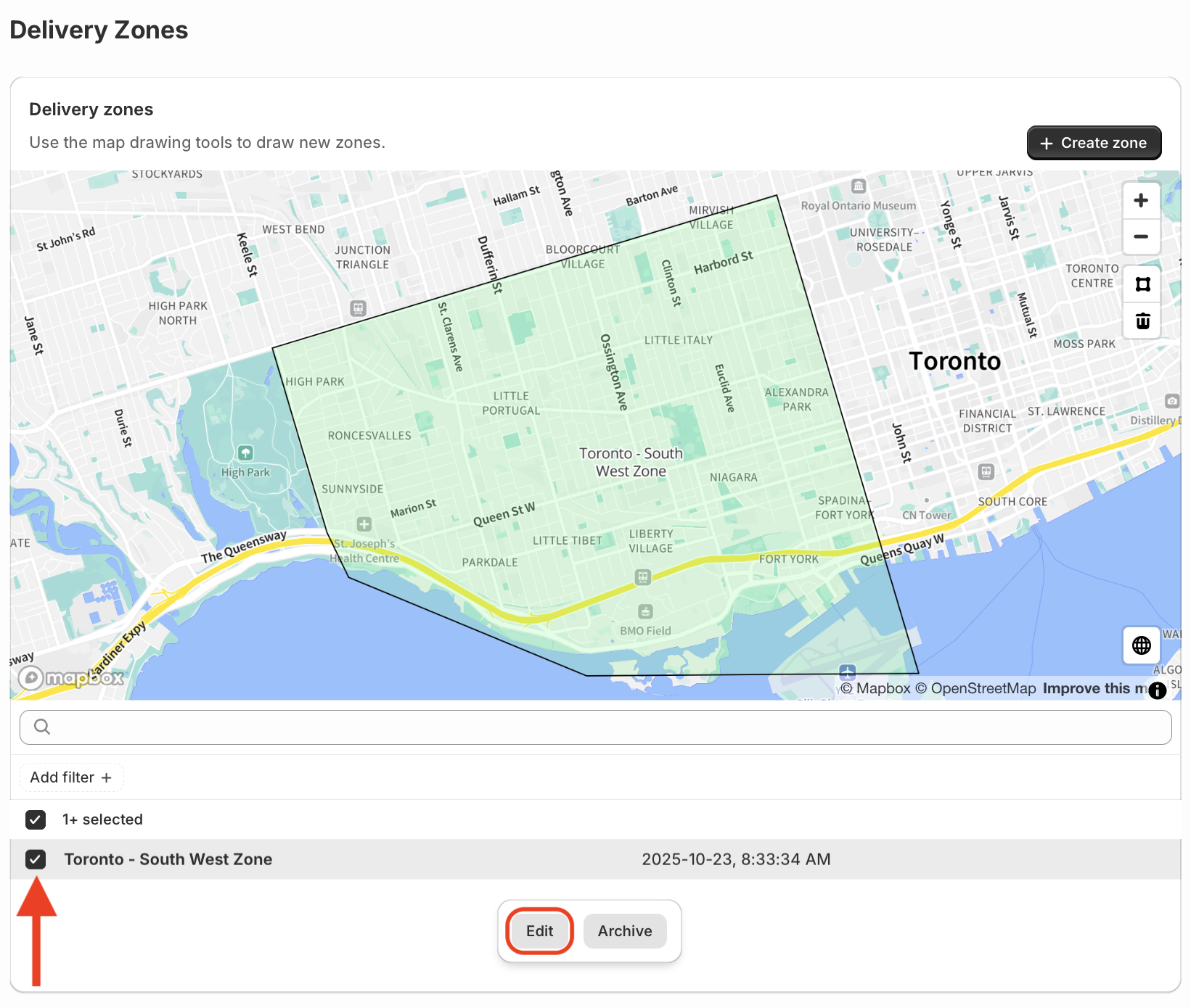 To edit an existing zone, from your EasyRoutes Settings > Delivery Zones tab, use its checkbox to select it, then click the Edit button that appears at the bottom of the page: