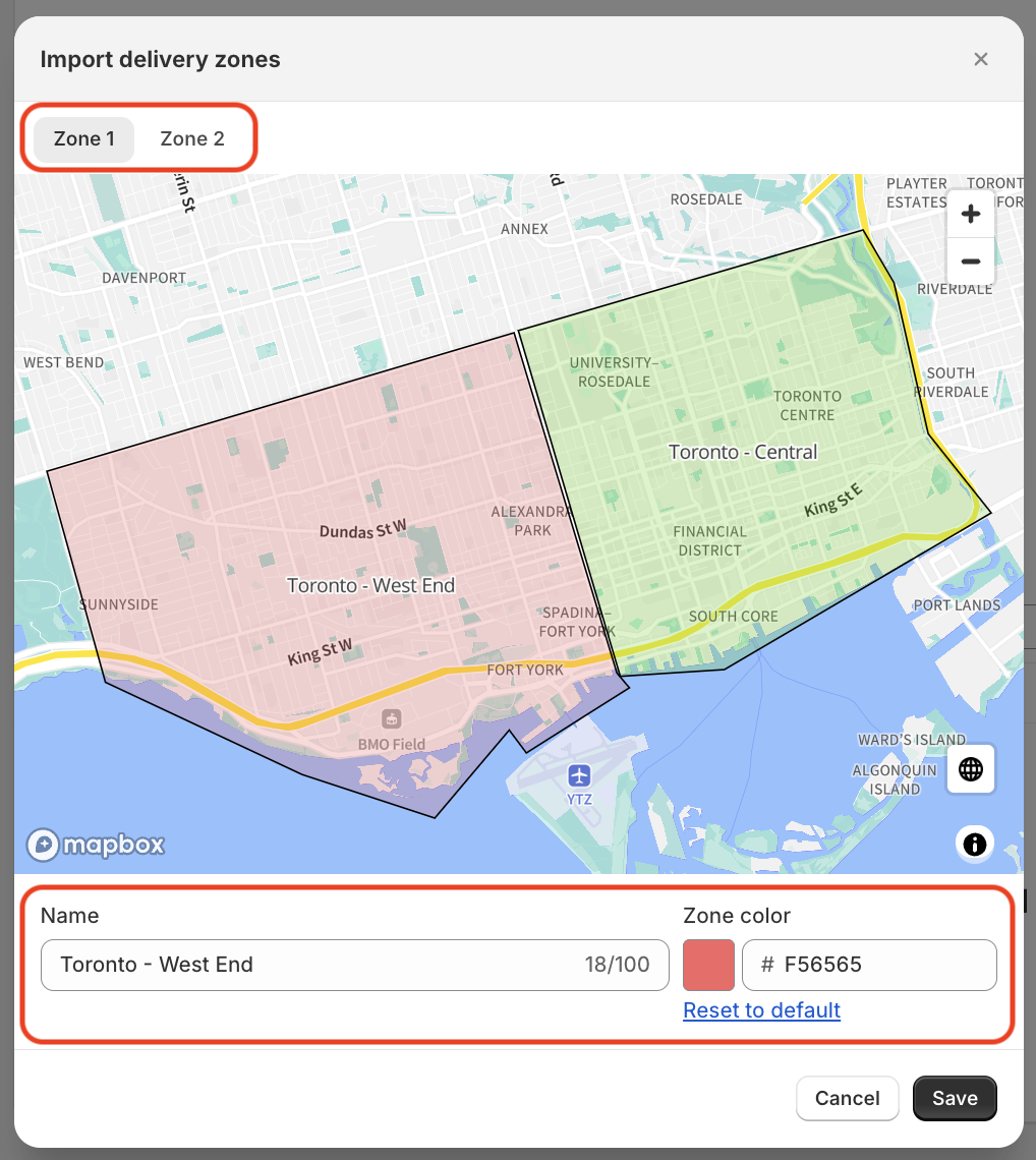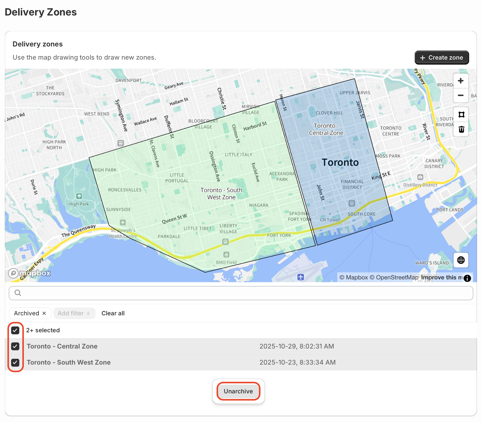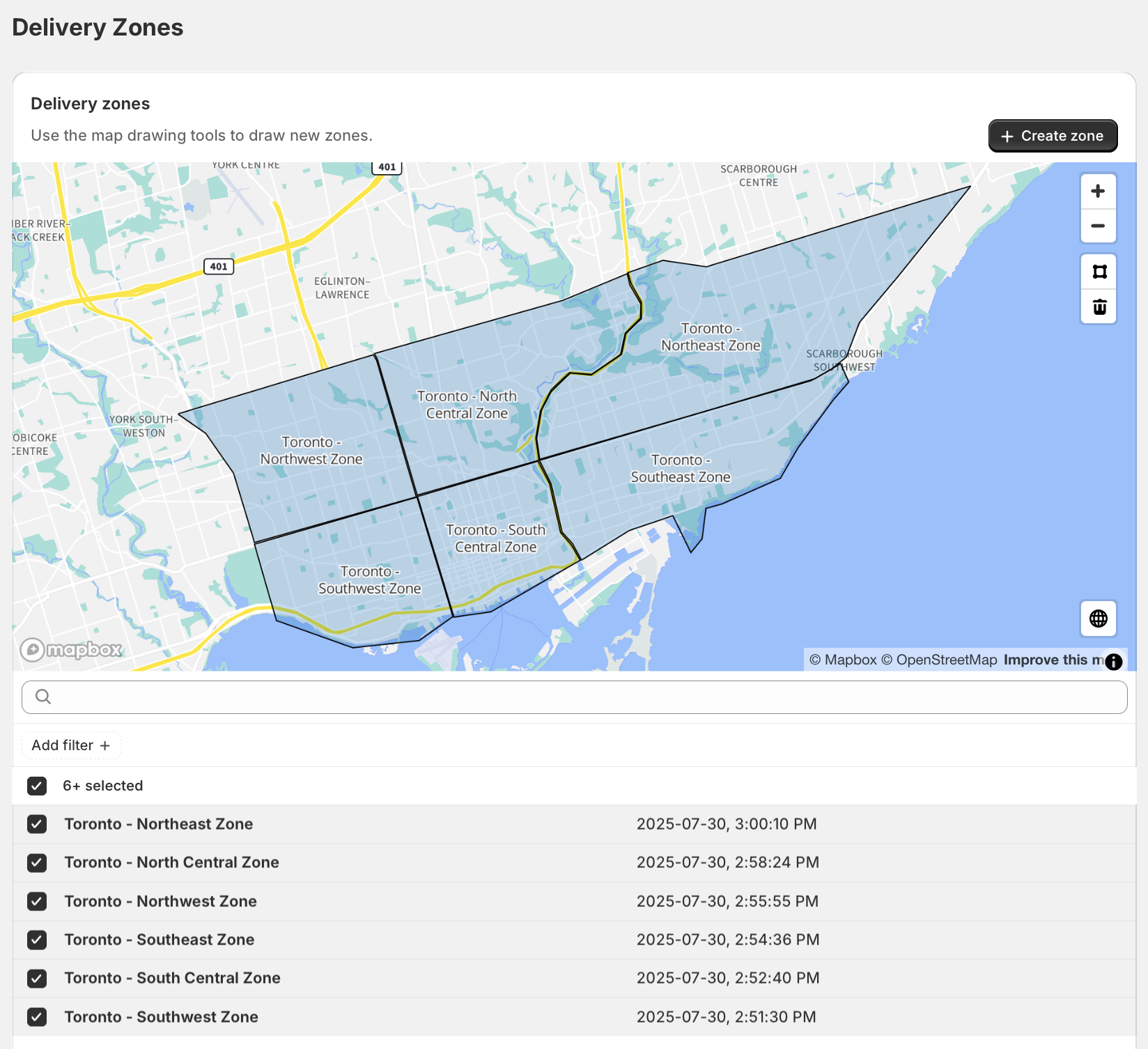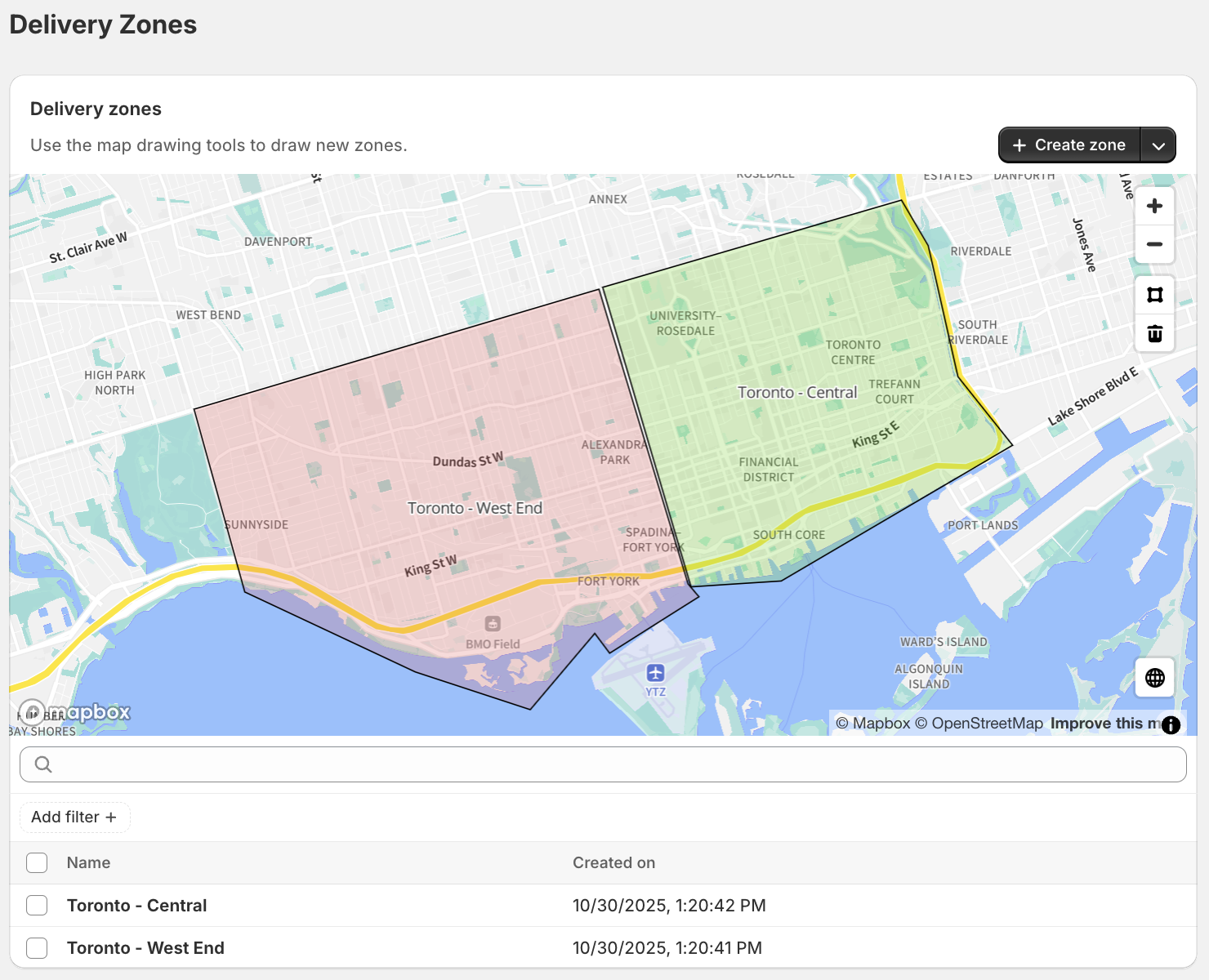 Repeat this process to create as many zones as needed for your delivery workflows. All configured zones will be listed in the table below the map, and can be toggled on/off using the checkboxes to see their boundaries on the map view: