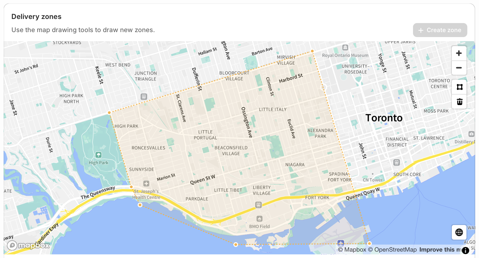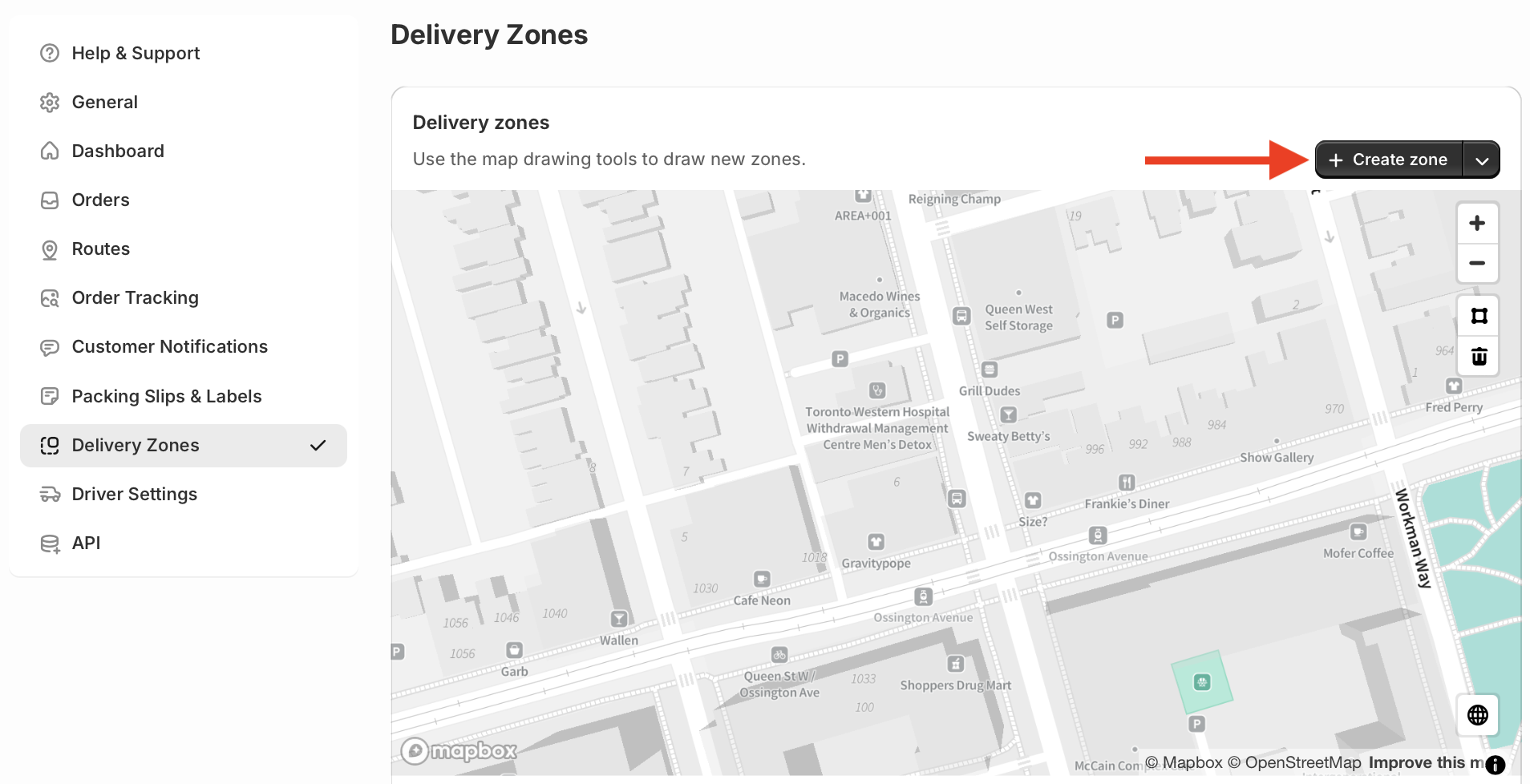 To start, navigate to your EasyRoutes Settings > Delivery Zones tab, and click the Create zone button above the map: