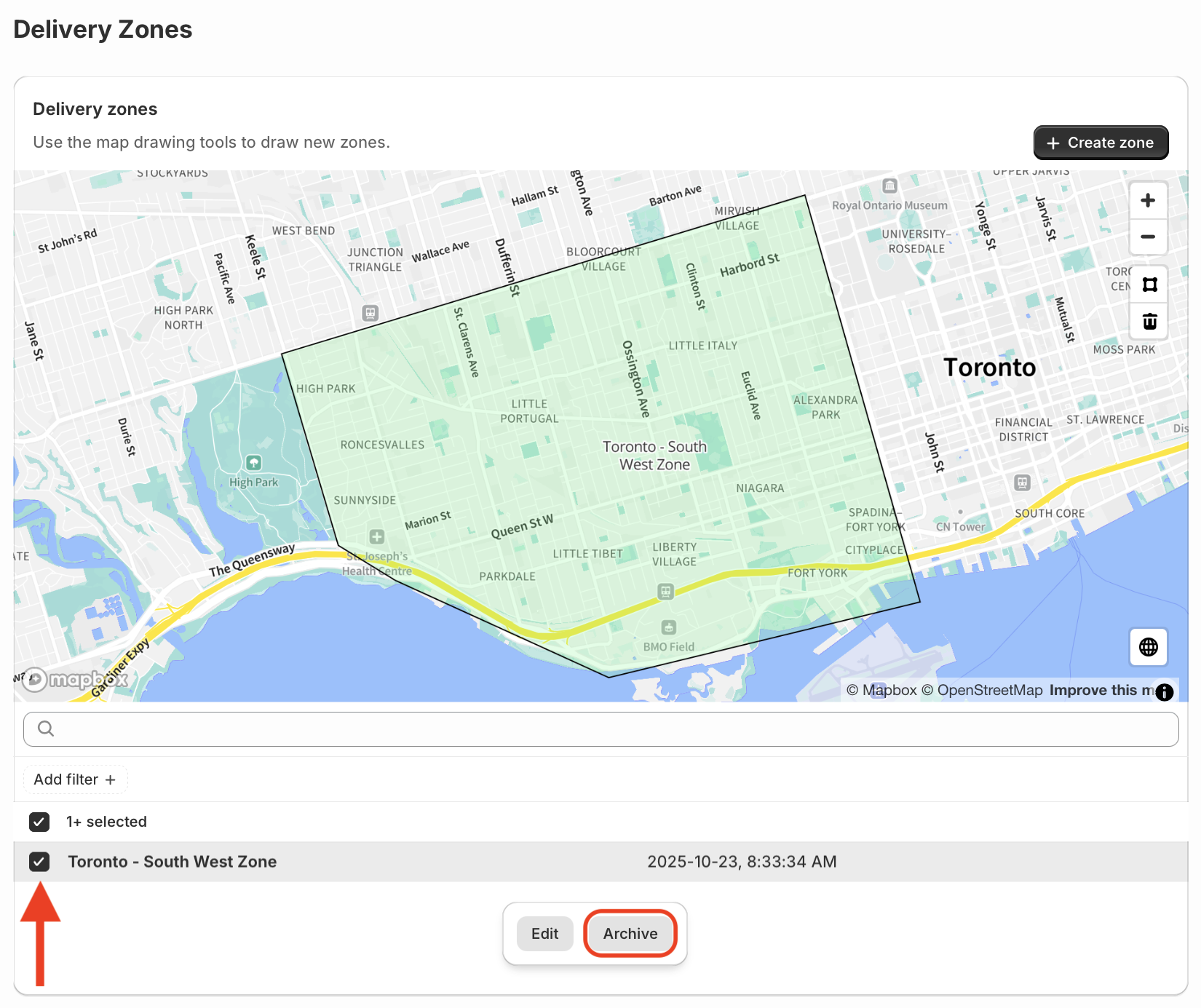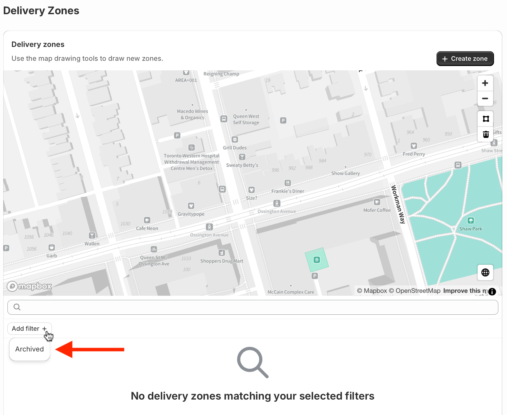 Archived zones can be reviewed (and unarchived) by clicking the Add filter controls below the map, and selecting Archived (to show only archived zones) or All (to show both active and archived zones):