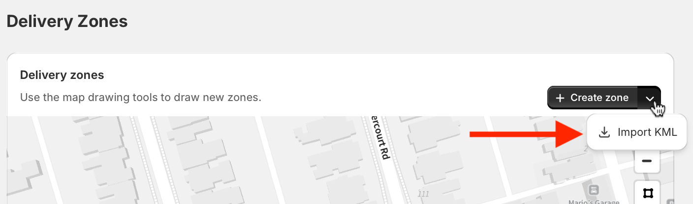 Once your .KML file is prepared, navigate to your EasyRoutes Settings > Delivery Zones tab, click the dropdown arrow on the Create zone button, and select Import KML: